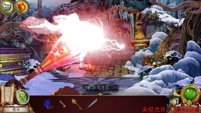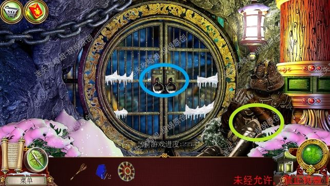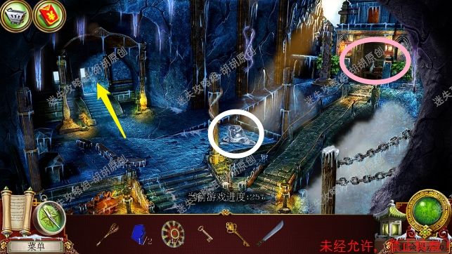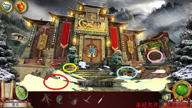 3.沿着前方的台阶进入宫殿大门,左侧红框雪地里扫去雪获得门锁片①,左边石像黄框处获得镐,右侧石像蓝框处开启寻物游戏获得一壶水,右边粉框门上获得短剑 3.1.2
