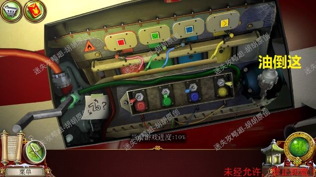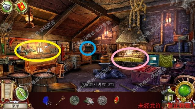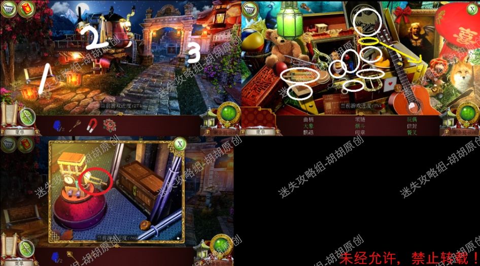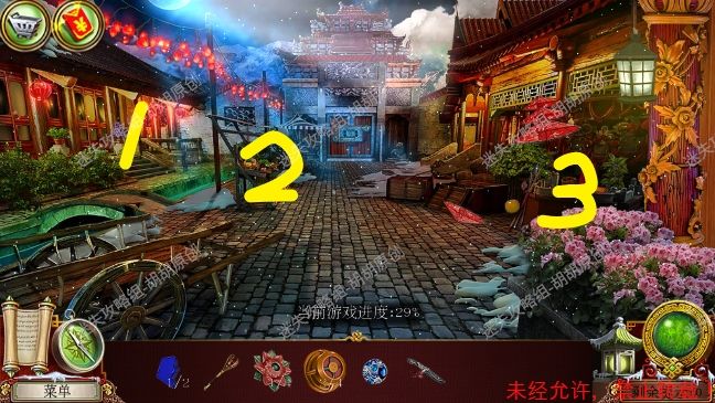 44.主广场,1处石桌上,安上蓝宝石,按照下图完成寻物游戏,获得龙徽①;2处马车获得笔记和龙徽②;3处获得花饰②和炸弹,顺着箭头进入房子 44.1.2