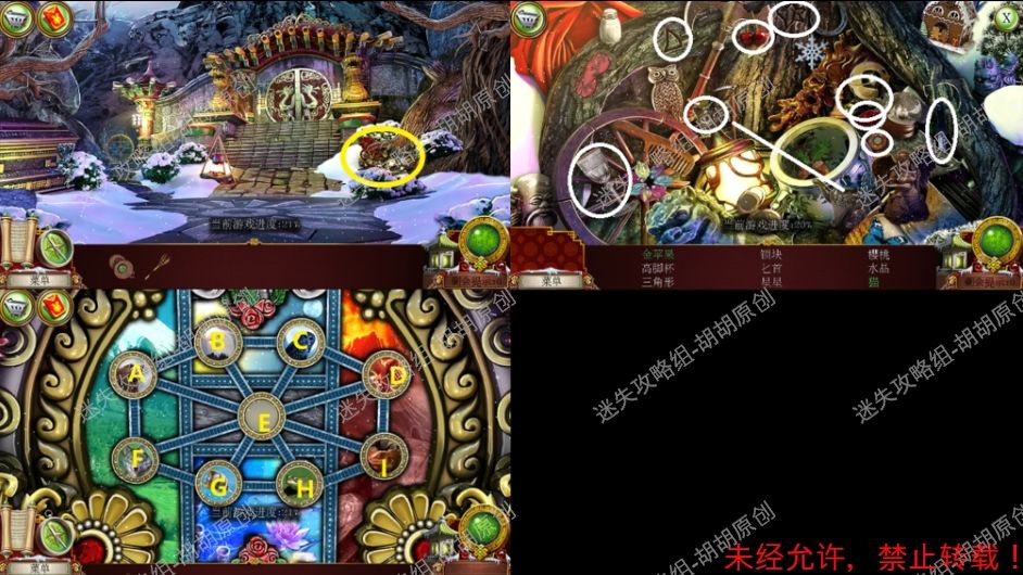 30.城门,右侧黄框处使用斧子进入寻物游戏,完成后获得锁块,将两块锁块放到门上,按照下图标记,G, H, I, D, C, B, E, H, I, D, E, C, D, E,A,F,G, E, A, F, G, E, I, D, C, B, E, F, A, B, C, D, E,将对应的动物放在对应的场景里,完成后获得蓝水晶① 30.1.2.3