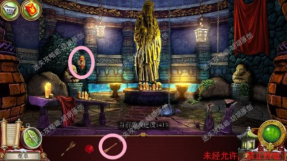 23.寺庙内部,红框火炉处开启寻物寻物游戏,按照下图完成获得战斧,右侧台阶蓝框处获得锁块,拐杖暂时拿不了,顺着左边箭头去往内室 23.1.2