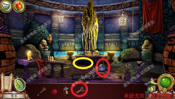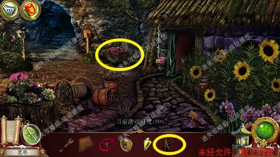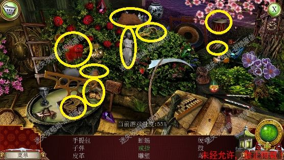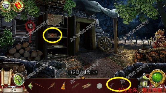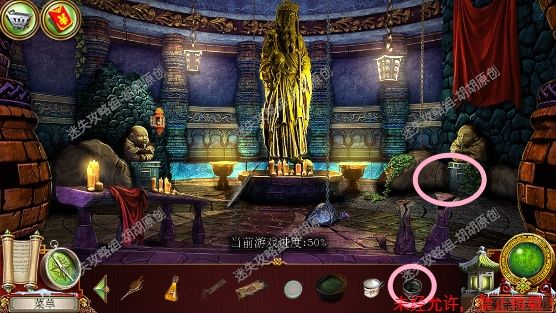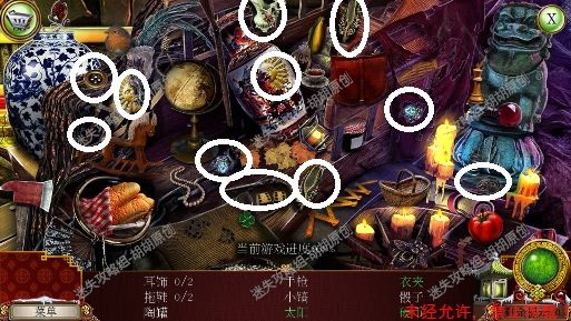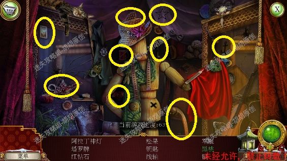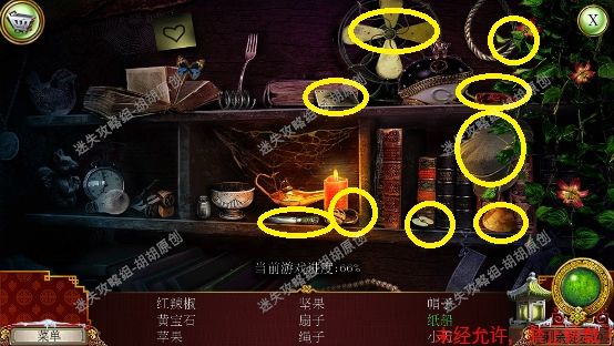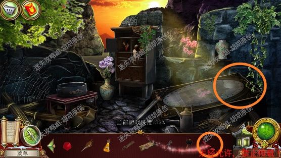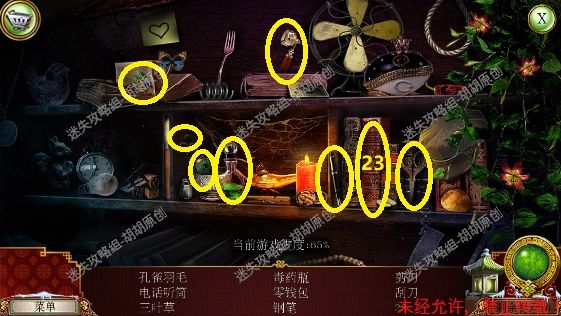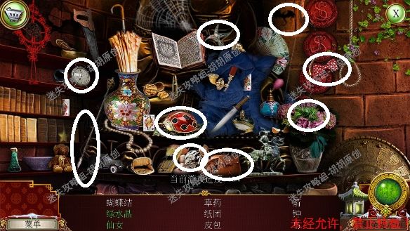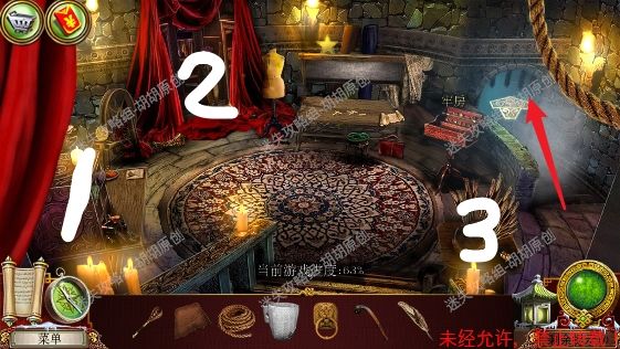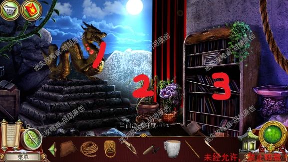 105.尖顶,1处安上龙之宝石;2处使用打火刀片割下芦苇;3处的书柜点进去,又是个寻物游戏,没想到吧(这真的是我玩的最多的寻物游戏了),按照下图完成游戏获得刮刀 105.1.2
