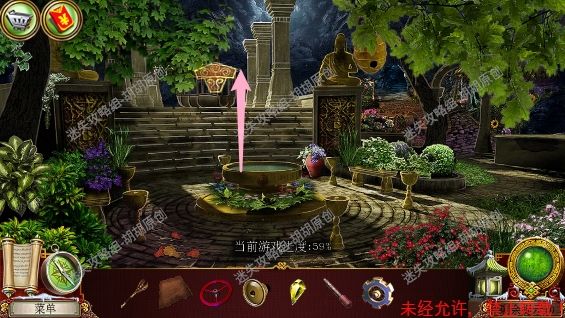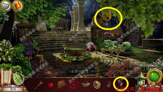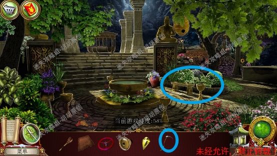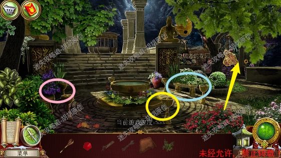 84.皇家公园,左侧花坛粉框处挑开树枝,获得扳手,右侧蓝框处花坛完成寻物游戏获得皮革,水池前黄框处获得树枝,右侧箭头处前往下一个场景,隐居者的花园 84.1.2
