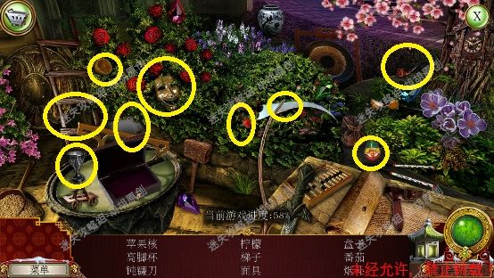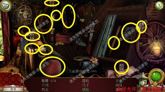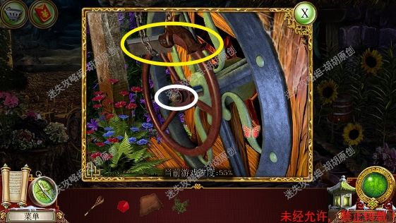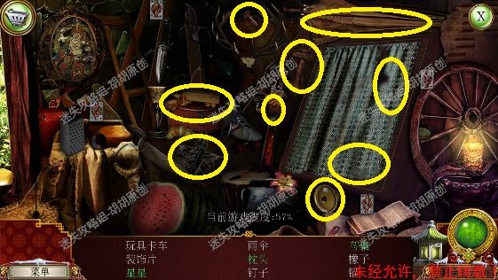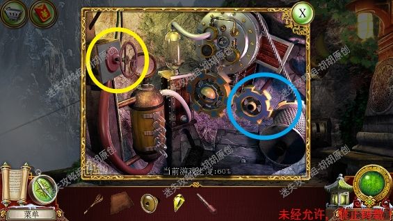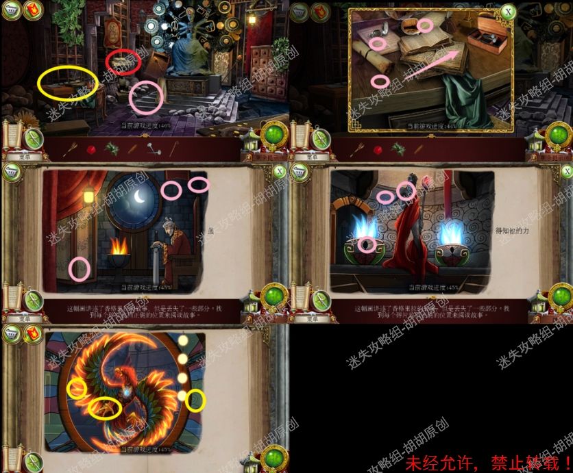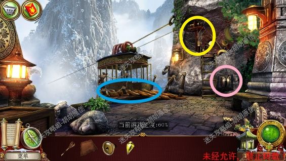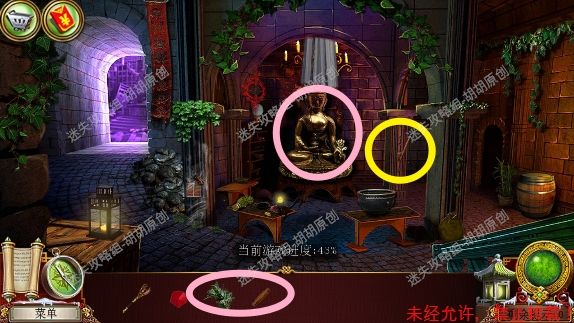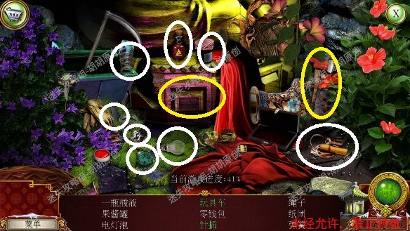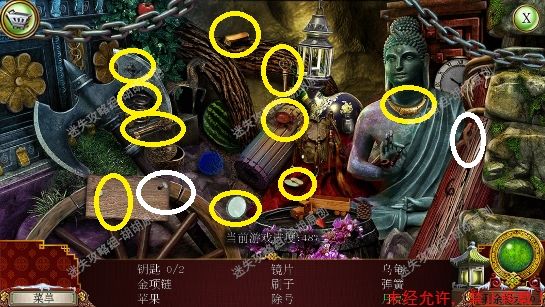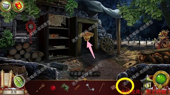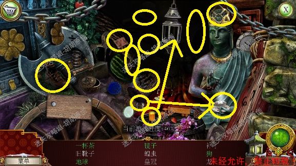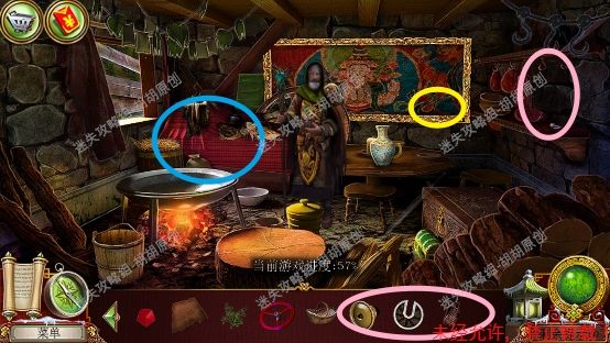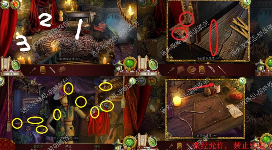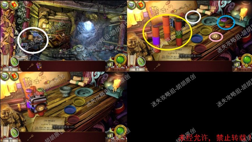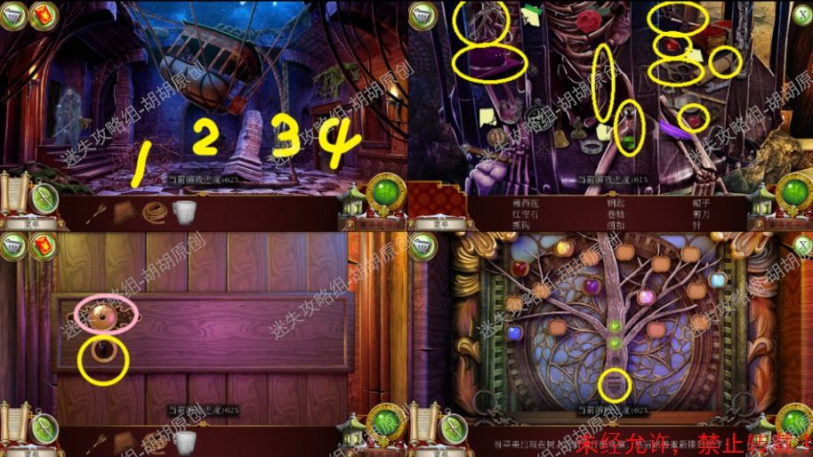 101.前厅,和npc对话,获得任务,要了解看守人家庭的信息 102.1处的树枝上点击获得绳子;2处的箱子,点击,旁边有个杯子;3处的笼子里打开开启寻物游戏,按照下图完成,获得大门钥匙;3处的大门点击,粉框处安上装饰片,黄框处插入大门钥匙,打开?还没,得玩个记忆小游戏,树枝上会有各种颜色的苹果,记住对应位置所有的颜色,记住后按下黄框,苹果掉落,将苹果放置正确位置,完成3组,大门打开,进入下一个场景,车间 102.1.2.3.4