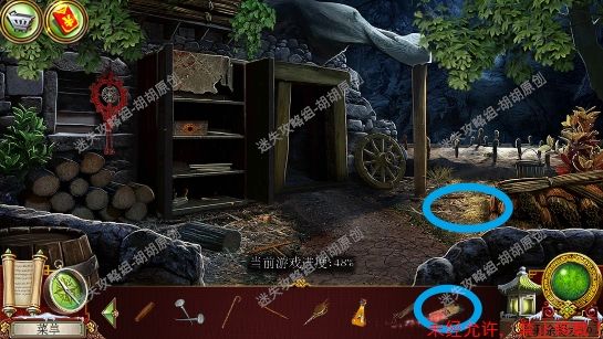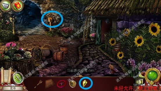 71.农家小屋,左侧蓝框处获得油和风箱;地上粉框处获得锯子;柜子完成寻物游戏(寻物游戏里拼图将小柜子打开,仙女剪影在柜子门后,黑色的仙女剪影),完成后获得针和线 71.1.2
