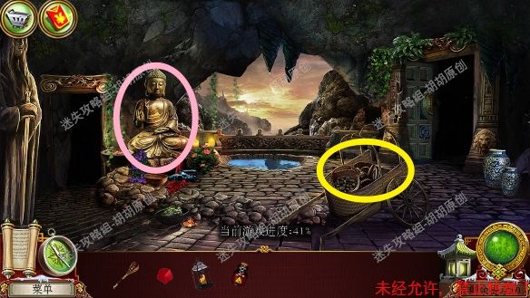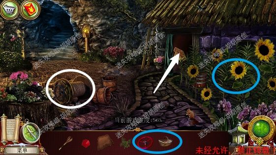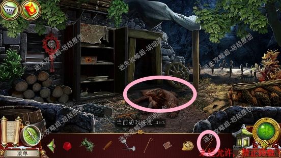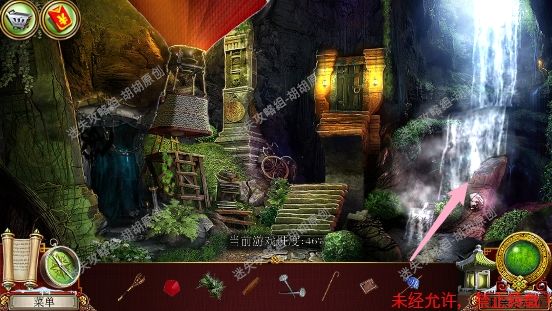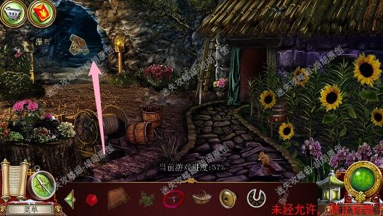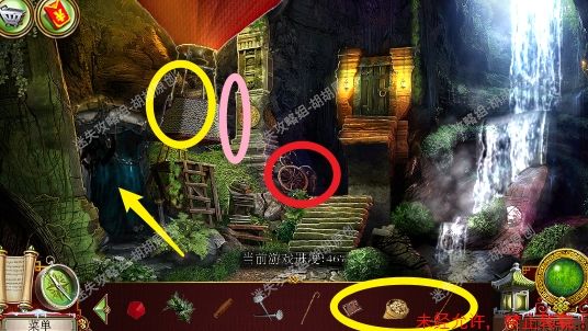 67.宽敞山洞,红框处完成寻物游戏获得皮革补丁;粉框处获得耙子,黄框处找到面包糠,左侧洞口进入下一个场景,小农场67.1.2
