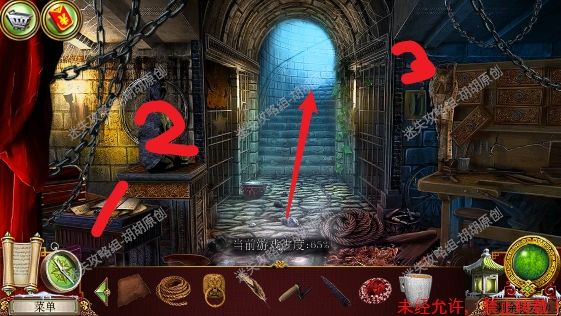 103.车间,1处工作台上找到刑拘零件;2处掀开红布,开启寻物游戏,完成后获得军棍;3处的桌子上获得羽毛笔;顺着箭头前往下一个场景,牢房 103.1.2