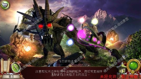119.退回到下图,图中黄框位置点击获得紫色的水晶,动画出现,水晶和拐杖组合,然后到了下面这个场景 119