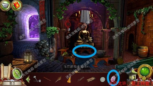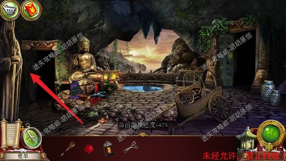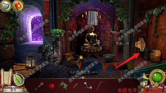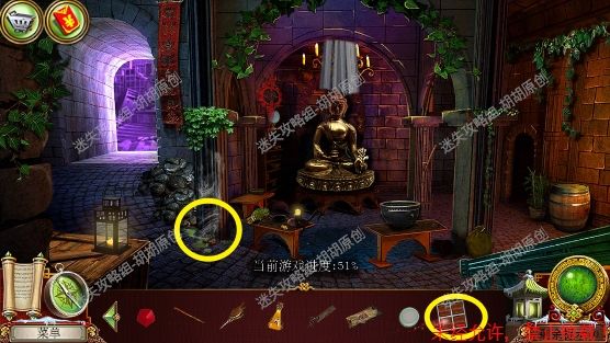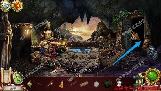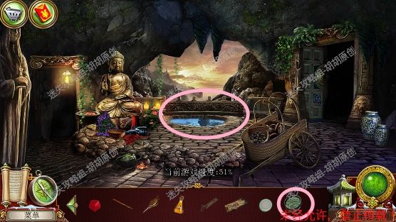 75.宝库,菩萨头顶红框处安水晶,完成小游戏(第一步先将白框处手的符号对应正确的位置,第二步将对应的物品放到正确的手上),完成后菩萨底下的箱子打开,箱子内先找到杵,杵和棍子组合后,敲击罐子,最后获得杵 75.1.3