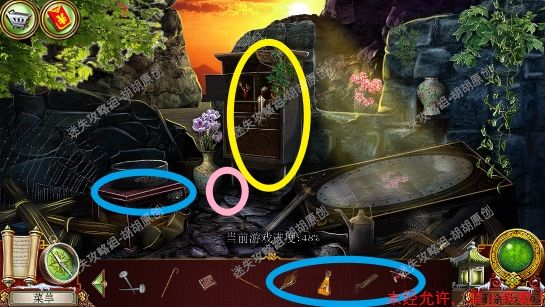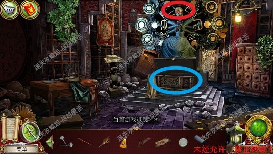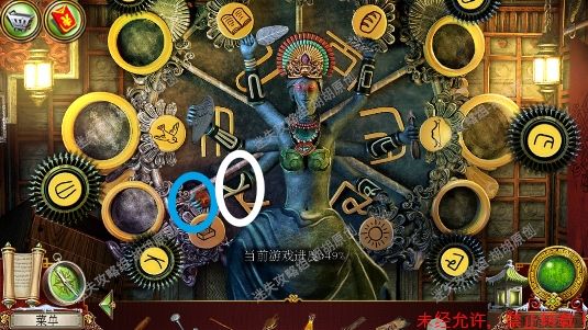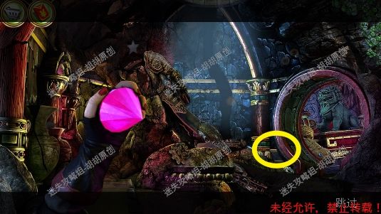 110.台阶右侧蓝框处使用锉刀,获得蓝宝石,白框处大红花处开启寻物小游戏,完成后获得红宝石(直觉这里还会再玩一次),中间黄框神坛处放上所有宝石,按照下图调整正确位置,点亮灯泡,通电,炸开通往审讯室的路 110.1.2.3