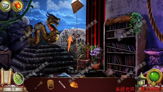 107.尖顶,对这远处的山那头放风筝,瞬间山显现出原形,点击山上的图形,获得笔记;接着右侧的书架(有股不祥的预感),开启寻物游戏,获得黄宝石 107.1.2