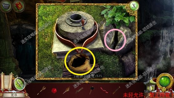 88.瀑布,左边粉框处安秤砣,完成小游戏(从里到外将口子对好,每一层先旋转外一层来控制内层),完成后磨石可以使用;右侧红框树洞处使用树枝,获得树脂树枝 88.1.2