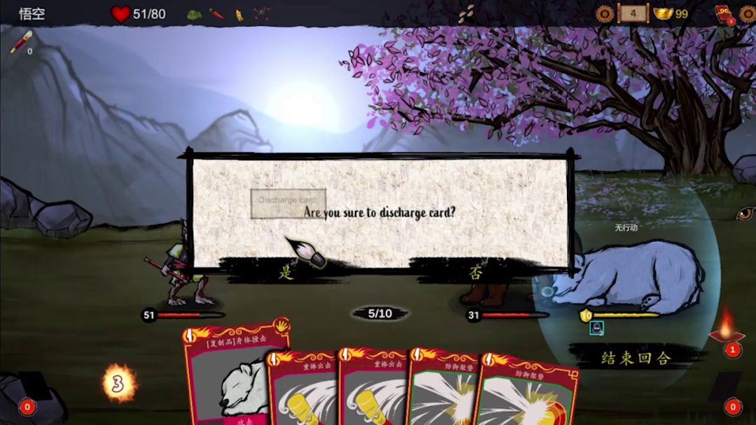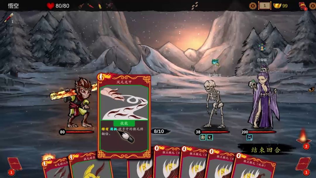 在起始事件中,悟空已经在五指山中被封印了五百年。此时由于灾星降临,天下大乱,观音来到五指山解开悟空的封印,希望悟空可以戴罪立功,查清灾星现世的真相,兼济天下,来修得正果。此时需要根据悟空的技能特点,选择合适的卡牌和物品。悟空手中有法宝金箍棒,擅长七十二变,连浑身的毛发都有神力,可供驱策。