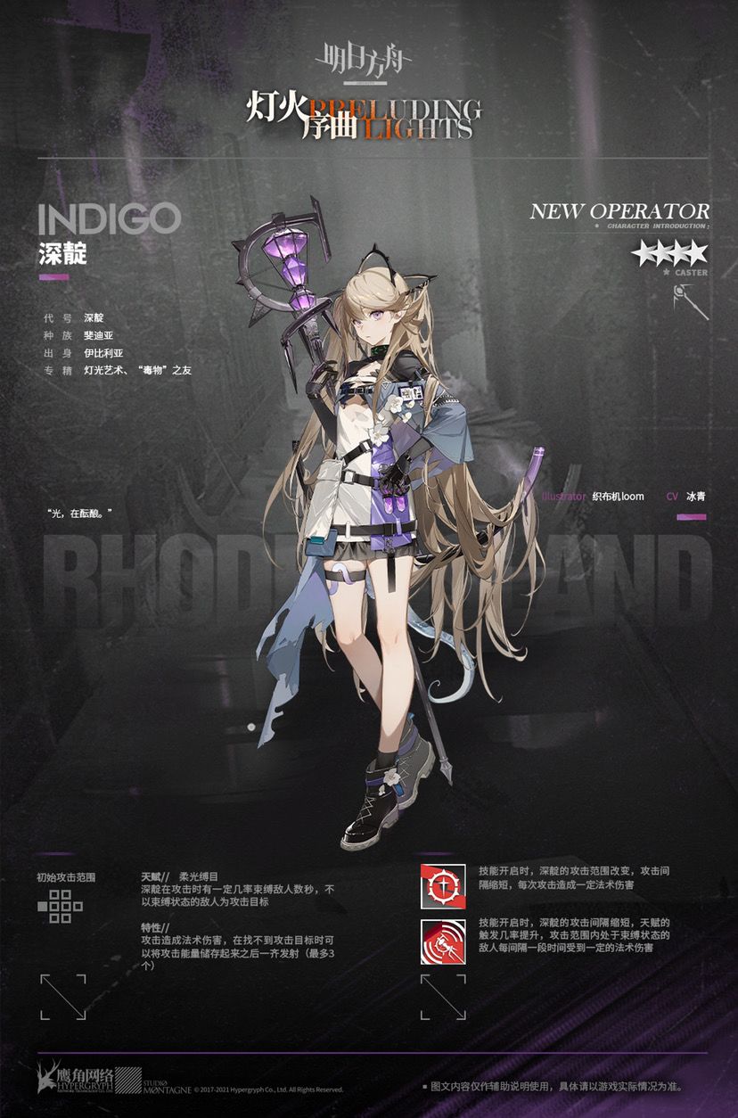干员深靛的描述是“灯光艺术”。靛蓝蛇是通体蓝黑色,下巴和颈部有时候会呈现橙色或红棕色,身上的鳞片在阳光下会映射彩虹色的辉光,非常漂亮。
