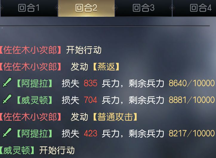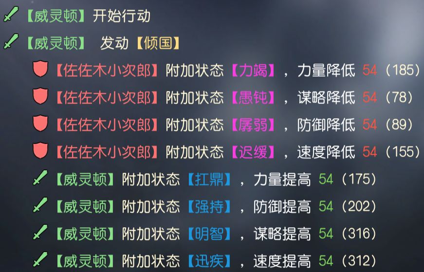 如图中,虽然佐佐木小次郎的速度被我们限制到了155,威灵顿速度达到312,几乎是他的两倍,但由于佐佐木小次郎存在先攻状态,第二回合后他仍是先手行动。可以看出,先攻能无视敌我属性,强行让将领获得优先行动权,只有在同时拥有先攻状态时,才会凭借速度高低重新排列行动顺序。
