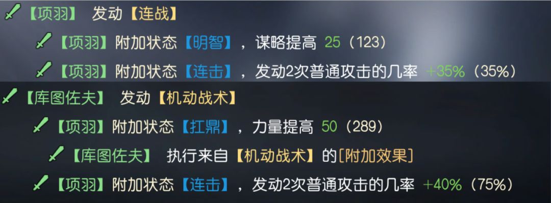 而如连击、奇谋、会心率等效果,即便执行的生效来源不一样,但因为最终效果属于“状态”而非行动,所以它们提供的几率会互相叠加,以提升其他技能造成的伤害。中毒、流血等持续伤害效果可共存,与群攻一样会单独计算每个状态的伤害,但重复的控制状态并不会叠加,只会刷新生效时间。