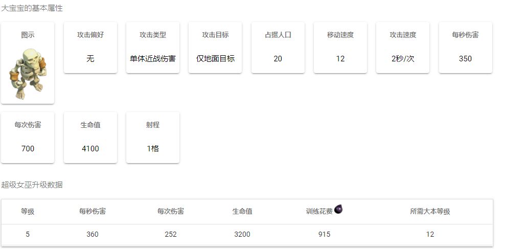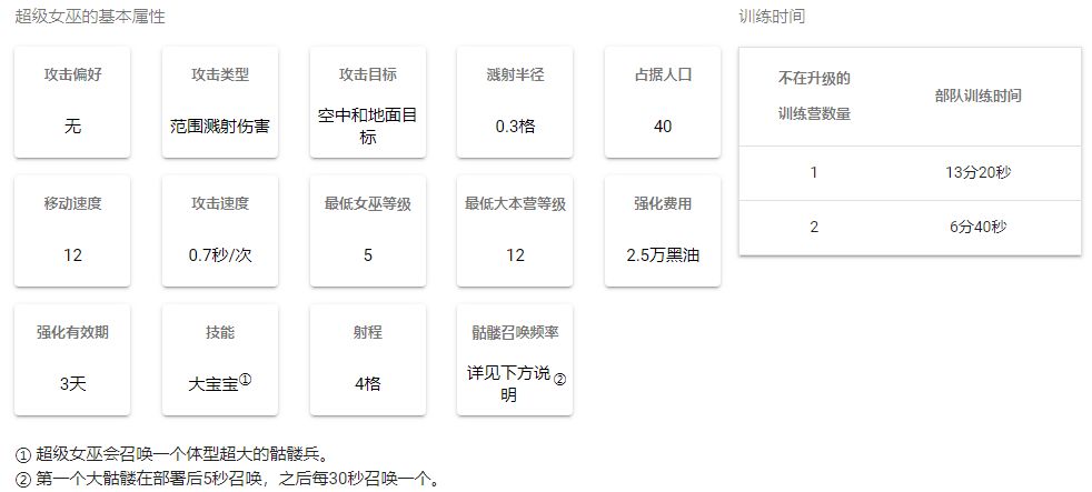 超级女巫数据:每秒伤害值:360、生命值:3200、训练费用:915黑油、召唤骷髅数量:1、训练时间:10分钟、攻击偏好:任何目标、伤害类型:区域溅射、所需空间:40、我的天啊!这是部落当中单位空间最大的兵种了,但愿超级女巫的战力能对得起她这么大的空间。