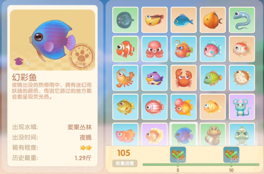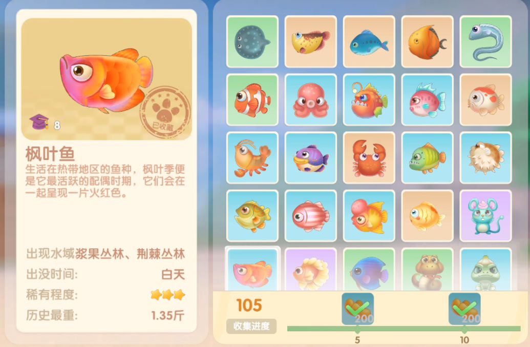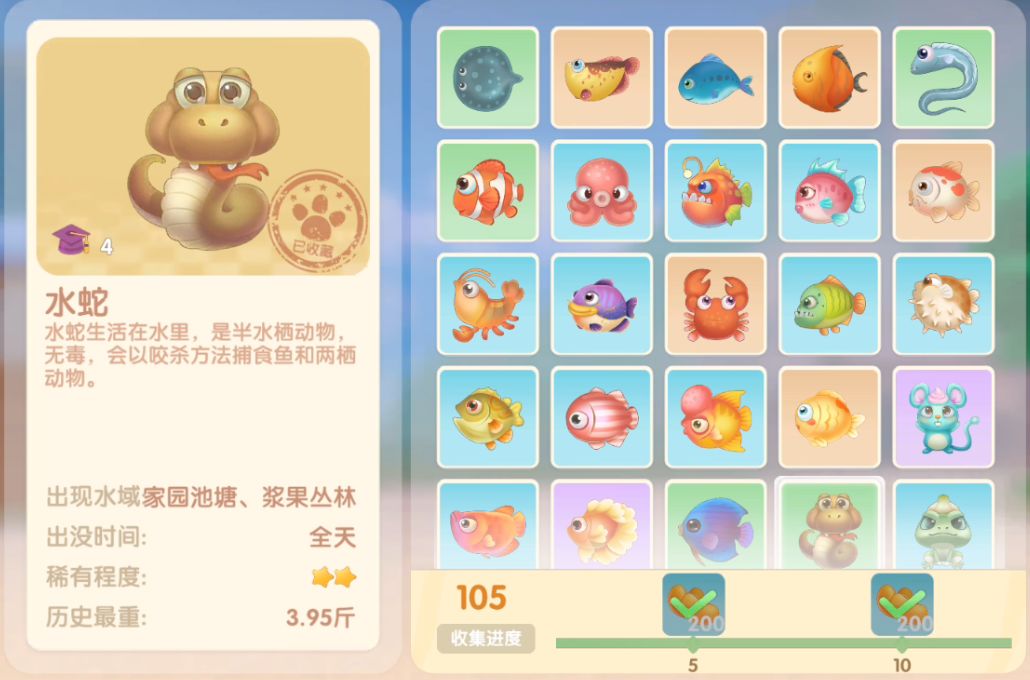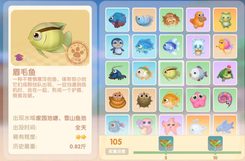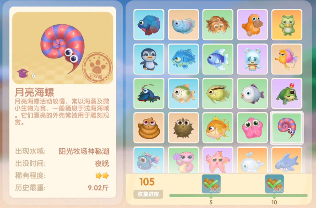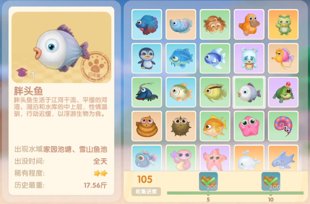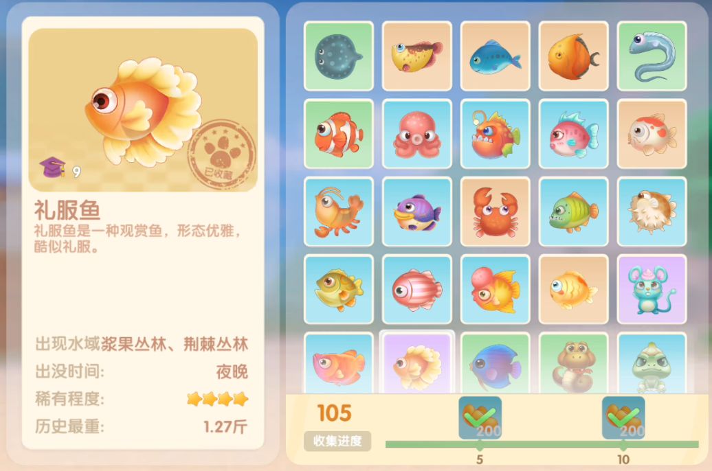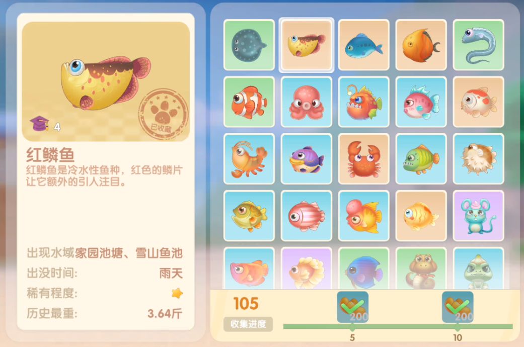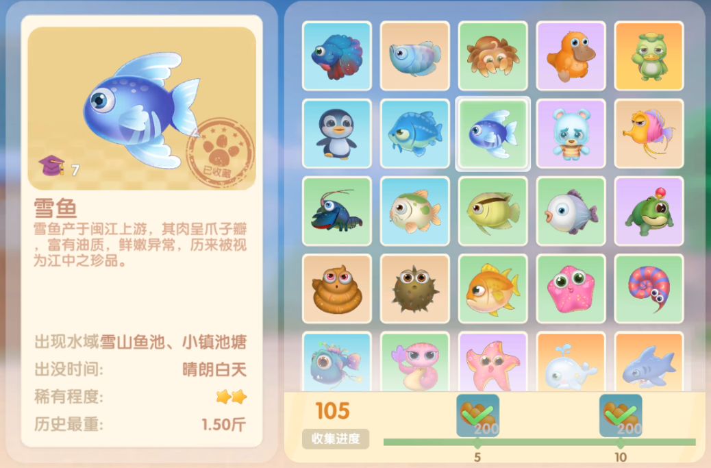 钓鱼要点1.钓鱼场地有五个,分别是家园 牧场 丛林 雪山 小镇池塘在前期图鉴较少的时候五个地方都钓一下,后面有缺的再看帖子去钓就好,家园特产的五种鱼锦鲤 金鱼 狗鱼 大闸蟹 小龙虾可优先收集