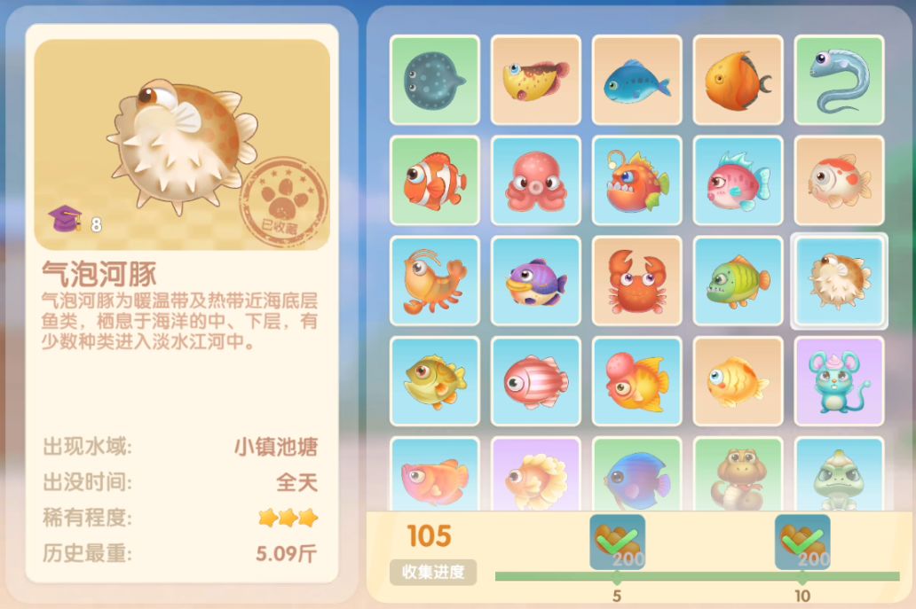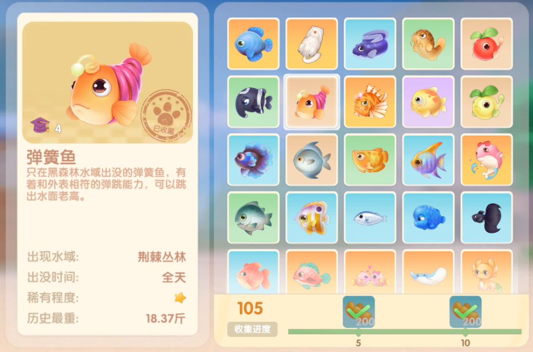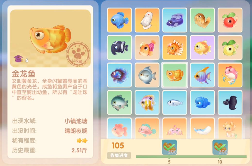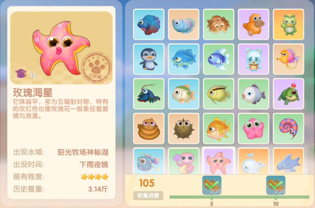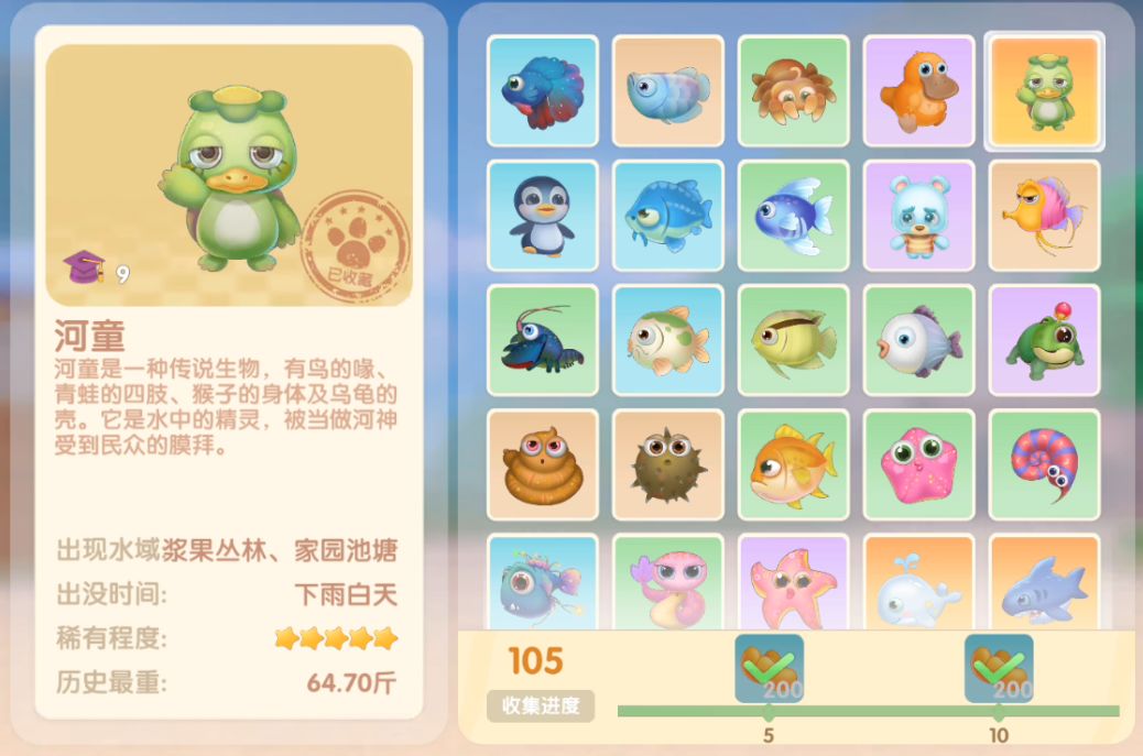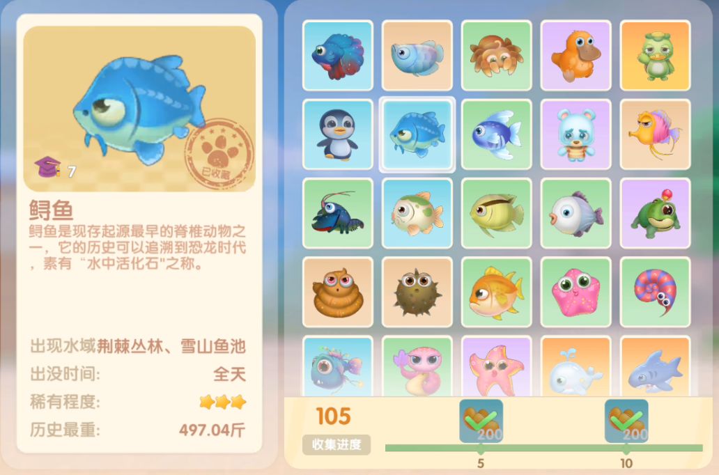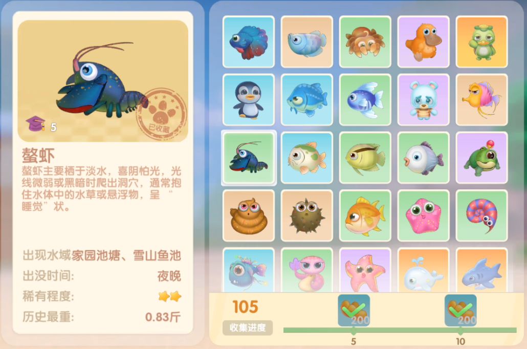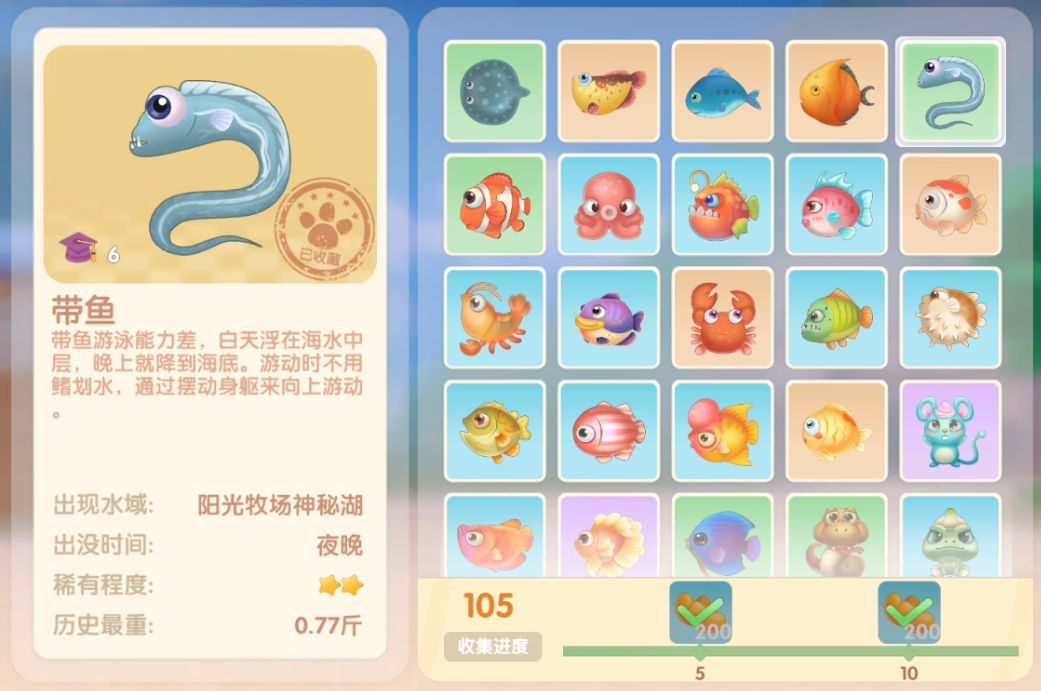 钓鱼要点1.钓鱼场地有五个,分别是家园 牧场 丛林 雪山 小镇池塘在前期图鉴较少的时候五个地方都钓一下,后面有缺的再看帖子去钓就好,家园特产的五种鱼锦鲤 金鱼 狗鱼 大闸蟹 小龙虾可优先收集