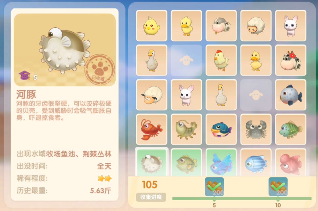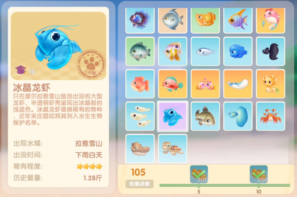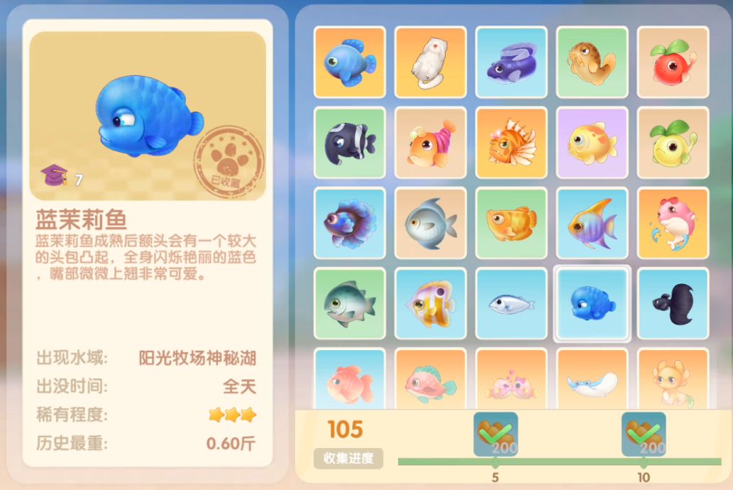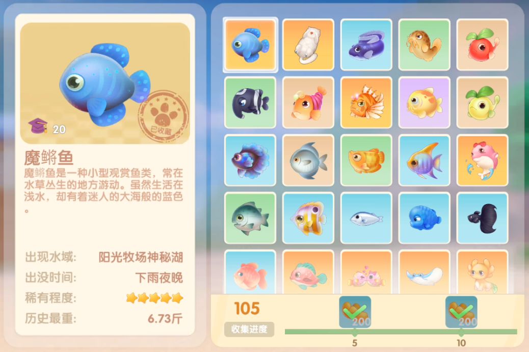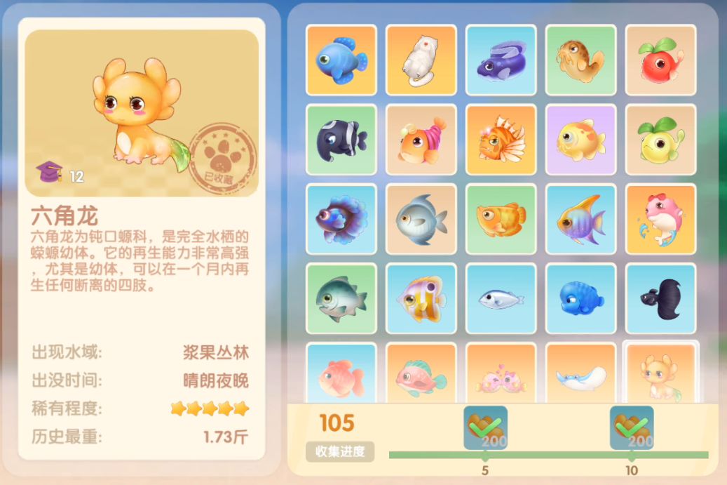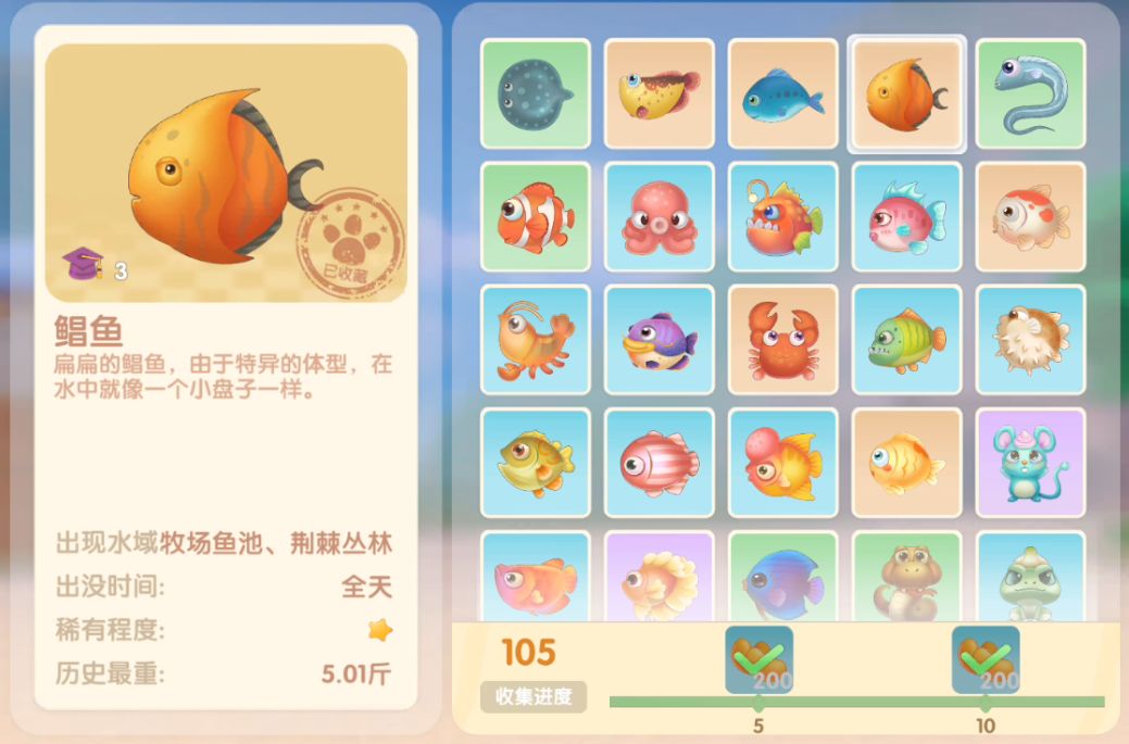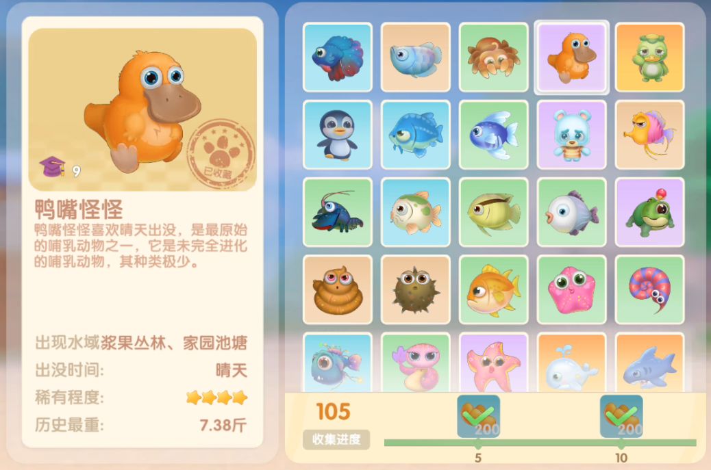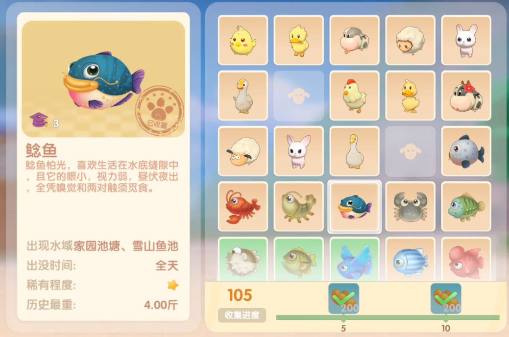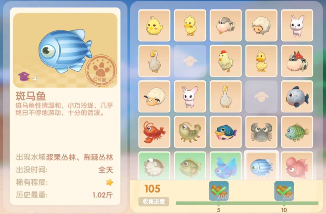 钓鱼要点1.钓鱼场地有五个,分别是家园 牧场 丛林 雪山 小镇池塘在前期图鉴较少的时候五个地方都钓一下,后面有缺的再看帖子去钓就好,家园特产的五种鱼锦鲤 金鱼 狗鱼 大闸蟹 小龙虾可优先收集