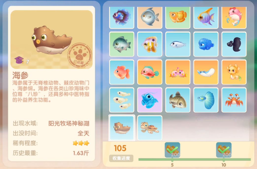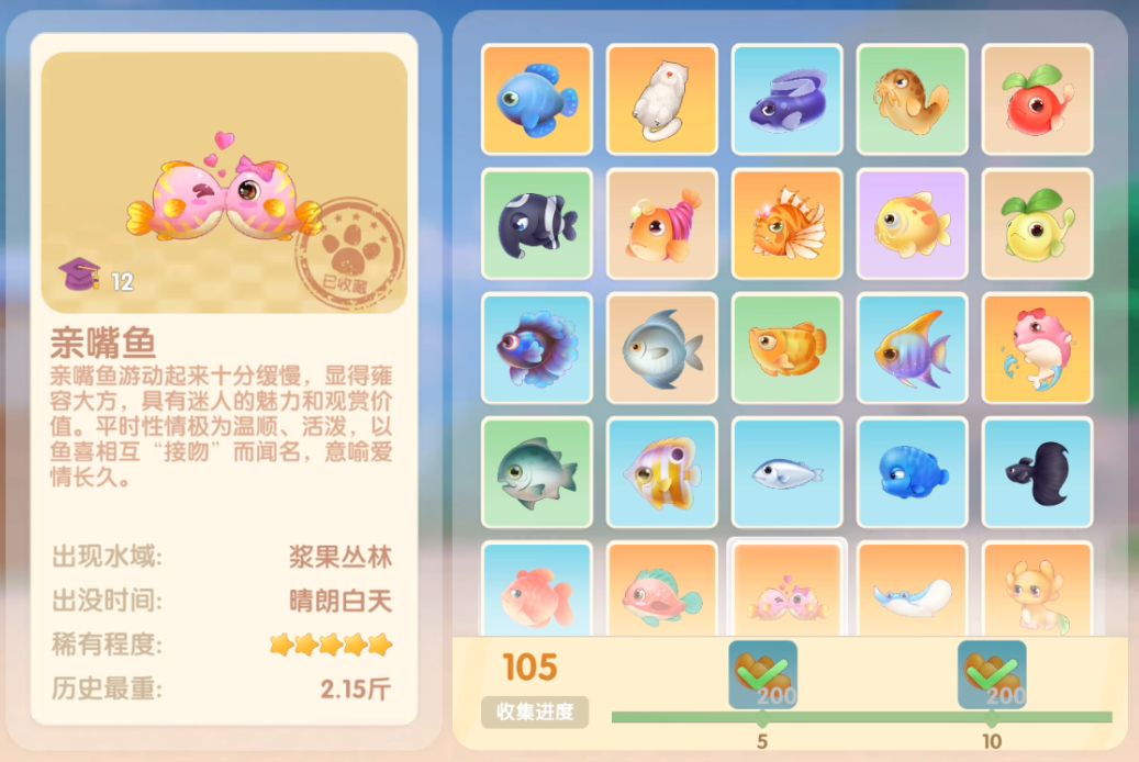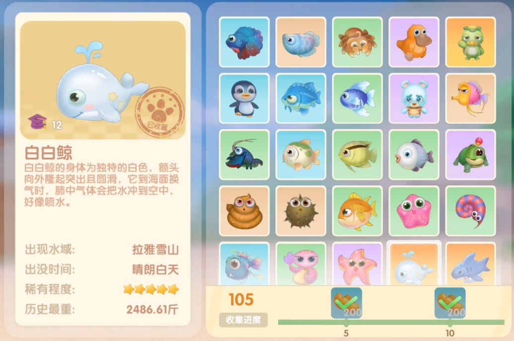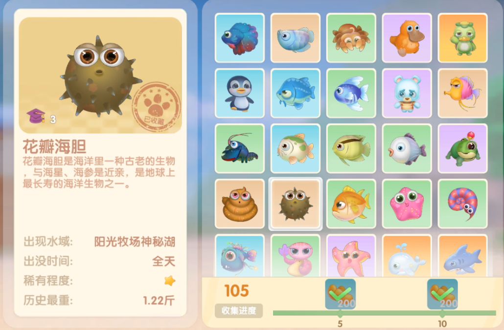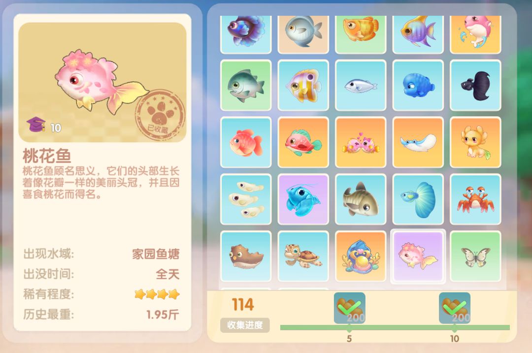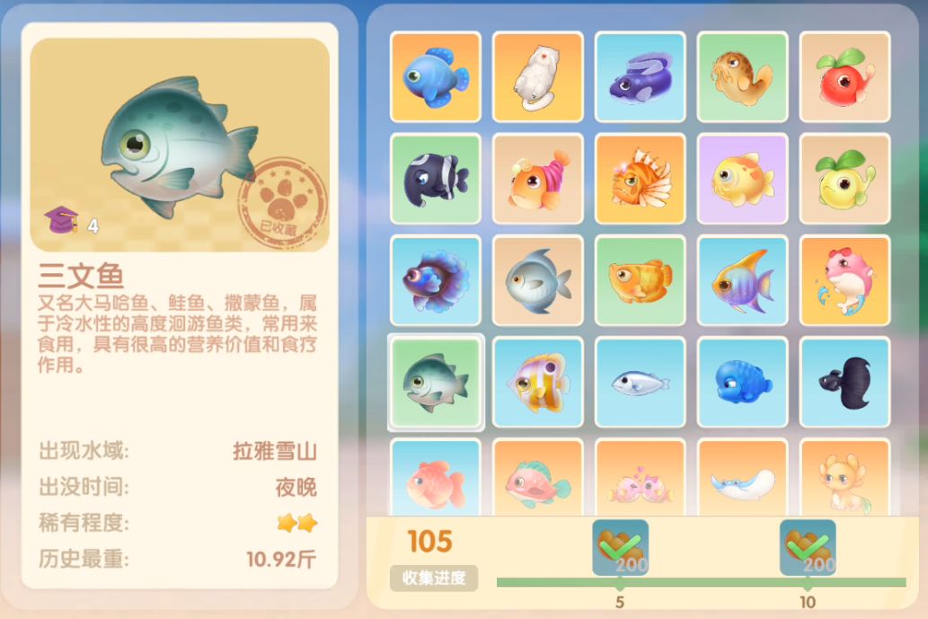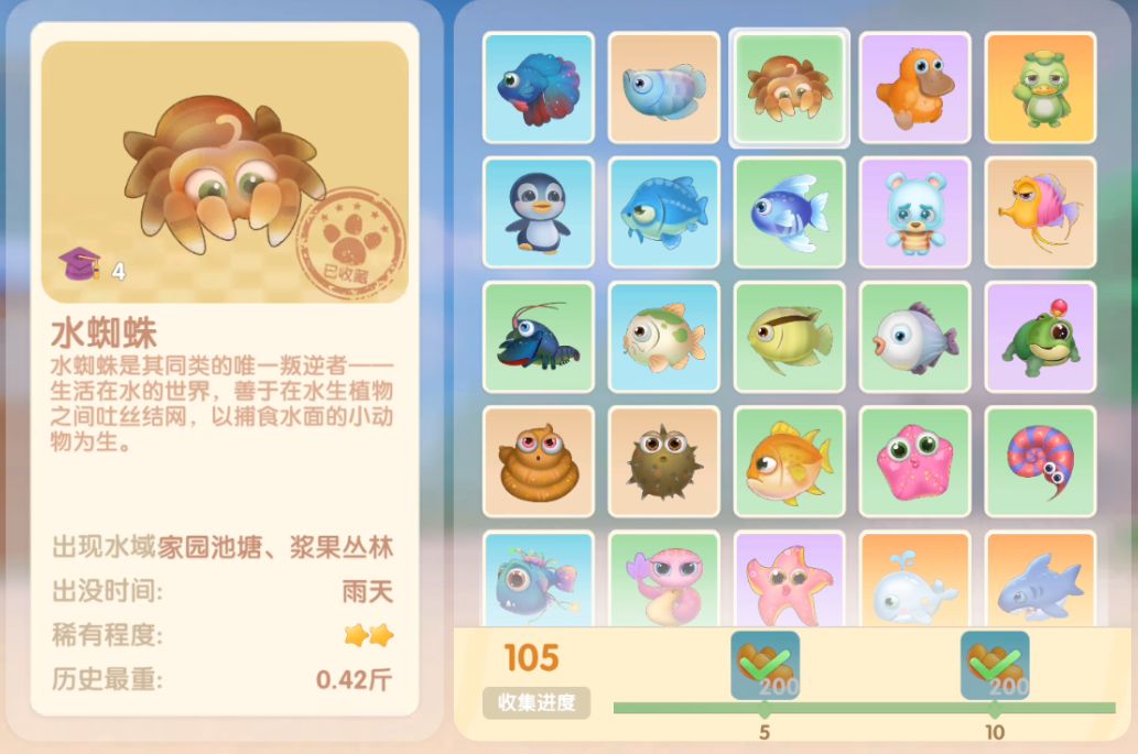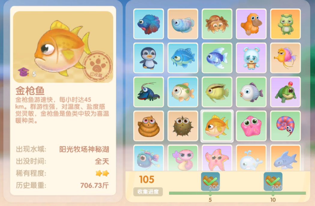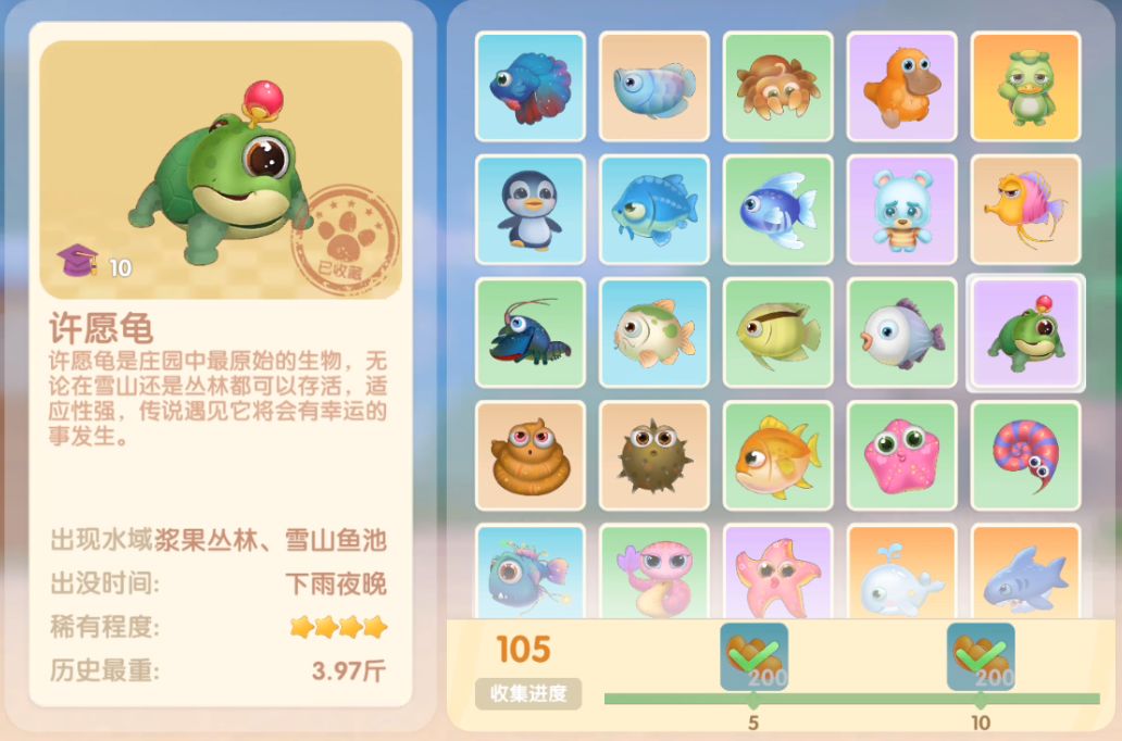 钓鱼要点1.钓鱼场地有五个,分别是家园 牧场 丛林 雪山 小镇池塘在前期图鉴较少的时候五个地方都钓一下,后面有缺的再看帖子去钓就好,家园特产的五种鱼锦鲤 金鱼 狗鱼 大闸蟹 小龙虾可优先收集