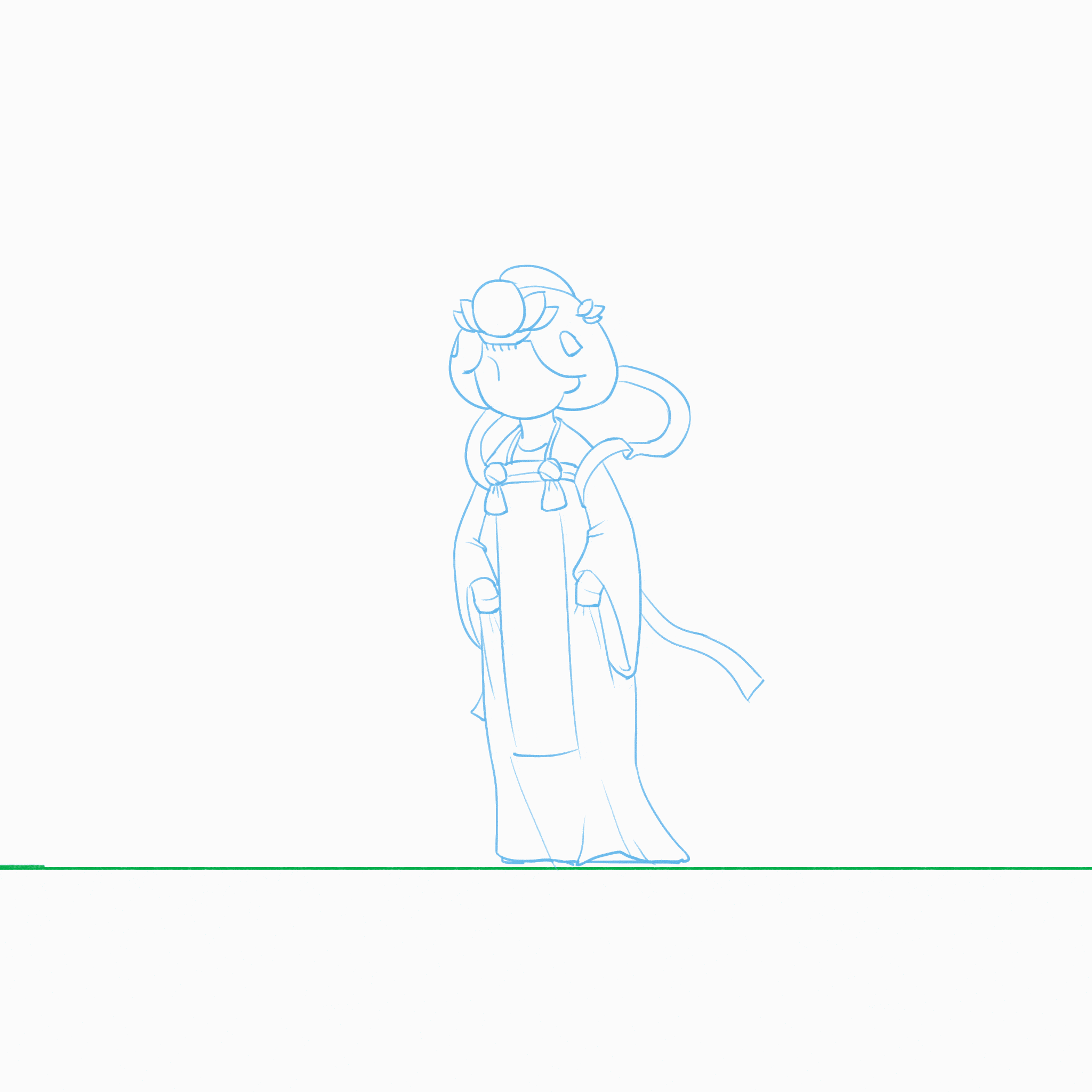 反复测试之后,我们的美术同学就会将自己的想法快速描摹出一组火柴人形象,每个动作都会有这样一组火柴人当底稿。然后再在这个基础上把公主的形象画出来匹配,之后会用Pr验证流畅性并做成动画。