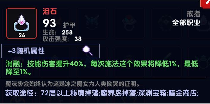 戒指:泪石,属性选择(建议必带木攻+爆伤,剩下的属性根据自己面板选择暴击或者穿透),因为泡泡龙刷图基本属于三开关+法阵十几秒放一个,技能频率很低,赌狗不适合,元素戒指又被稀释的一塌糊涂,泪石是最好的选择。