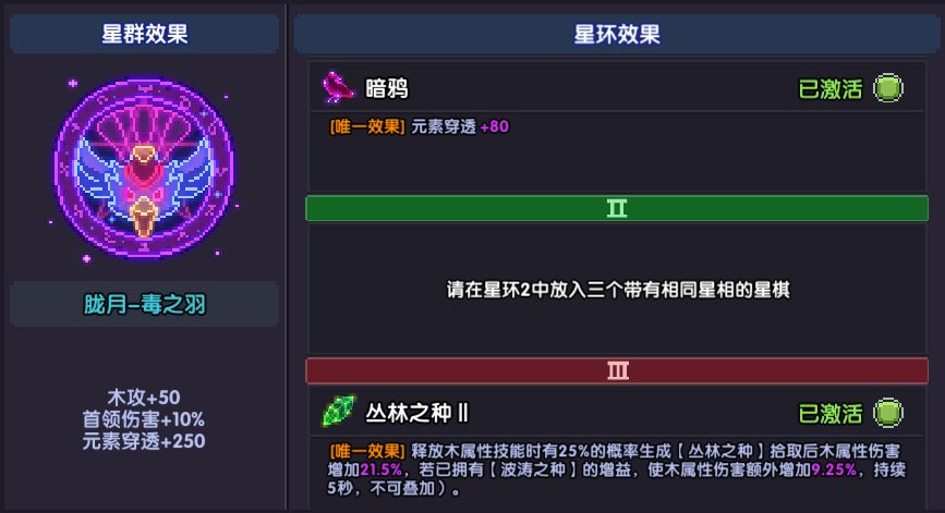 新人前期凑不出星群的时候,可以选择三环日+二环巫+一环乌鸦/木。