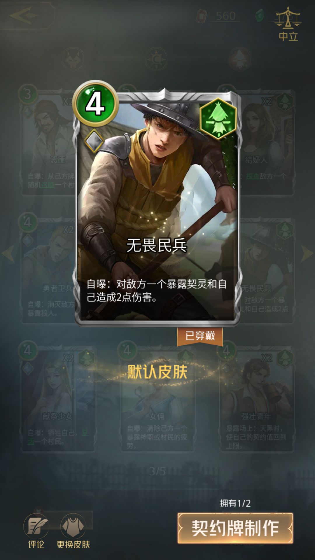 卡牌:无畏民兵+村庄长老。这个套路至少我目前没有发现有别人用过,这两个角色配合就像武魂融合技一样。长老可以给村民临时+2契约值,这两点契约值不用的话翻回去会消失,而刚好民兵自曝之后会掉2点血(先把长老加血再掉)。