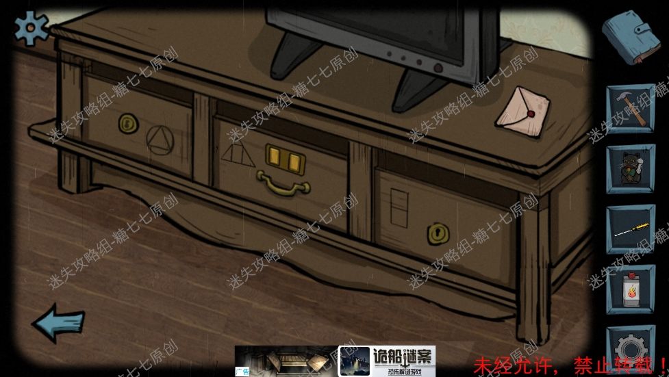 32、然后再回到二十年前(好烦QAQ),观察电视柜上的图案,圆形包围三角所以 圆形大于三角,三角包裹长方形,所以三角大于长方形,长方形包裹正方形,所以长方形大于正方形。所以按照圆形=22,三角=19,长方形=5,正方形=1。然后把他们转换成相对应的英文字母:SAVE。在电视机上的盒盒输入。33、电视上出现了一排文字,操起锤头,锤烂他。拿走打火机。33/331