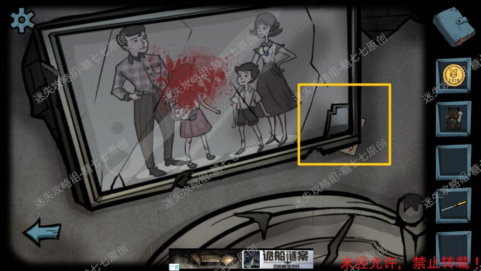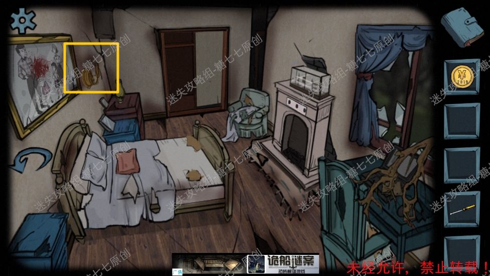 54、用另外一把钥匙打开沙发上的盒子,拿出清洁剂。再用清洁剂和抹布擦干净相框。55、再用抹布把床上大相框的血迹擦干净,取走针线。再用针线补好小熊。拿走眼睛中的宝石55