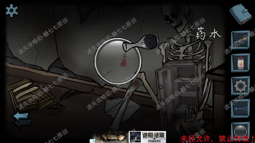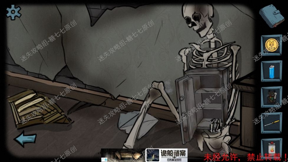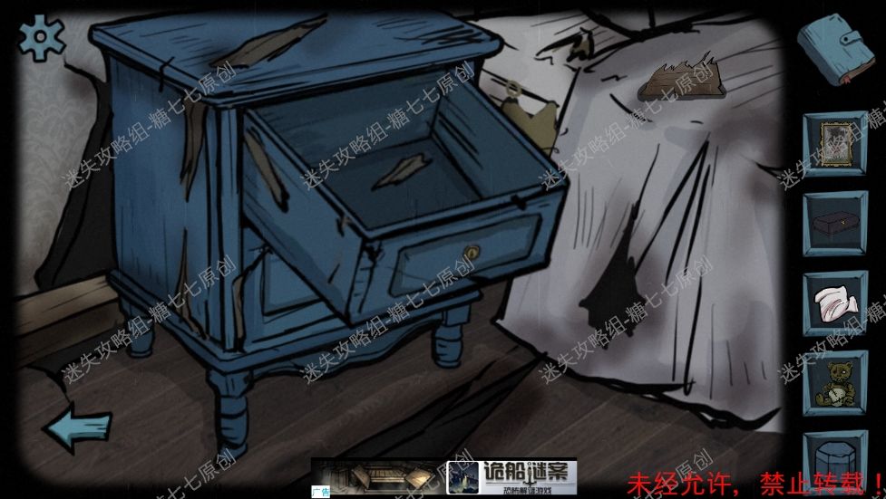 52、进屋后柜门打开了,拿走骨架旁的两把钥匙,骨架下一把,后面一把,从旁边的纸条看来妈妈好像有病。53、然后用钥匙打开床边的床头柜,拿走抽屉里的玩偶熊和盒子。53