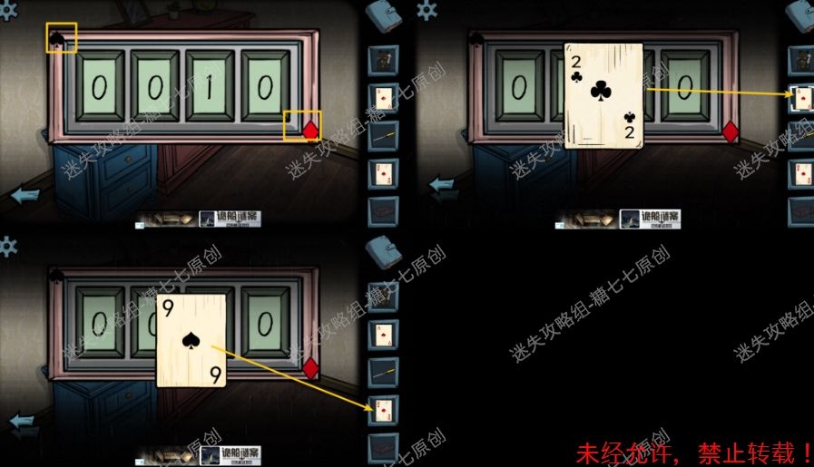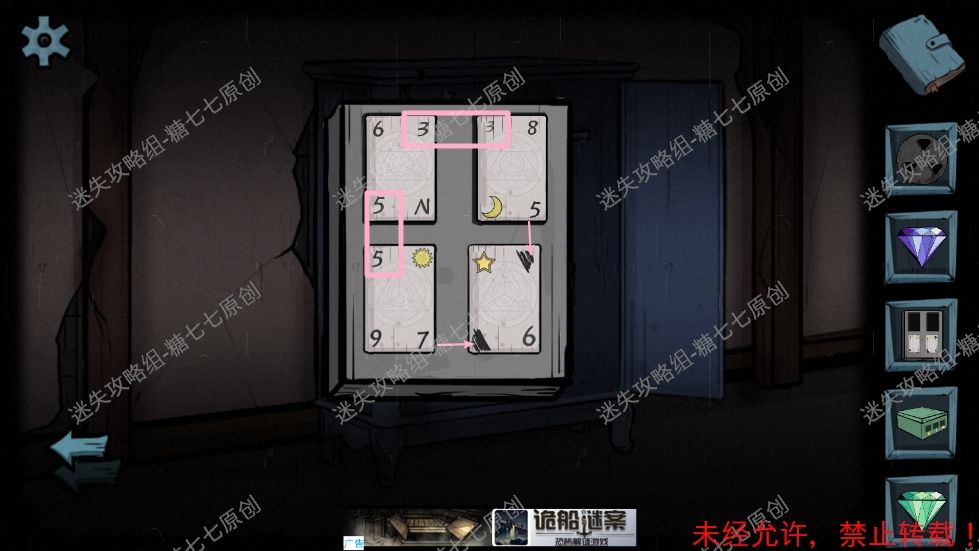 75、把卡牌放入卡牌板,但是还缺一张。然后回到现在。在同样的位置打开蓝色柜子,找到卡牌和钻石。把卡牌放入卡牌板。拼好之后可以发现,这里的数字是首位相接,所以7和6中间的数字是7,5和6中间的数字是