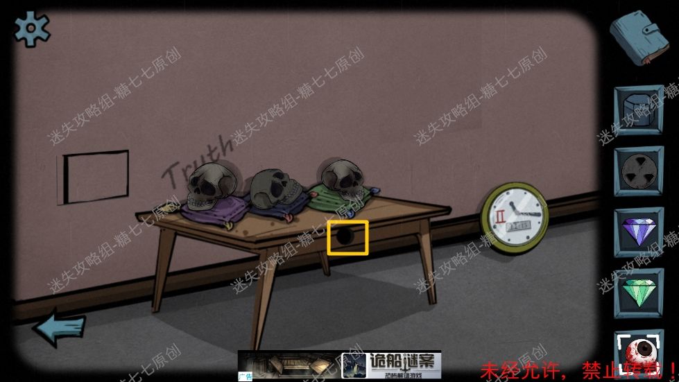 70、去屋里面把三个骷髅头都摆上,拿走表后面的匕首。注意后面有一个英文单词,Truth.70