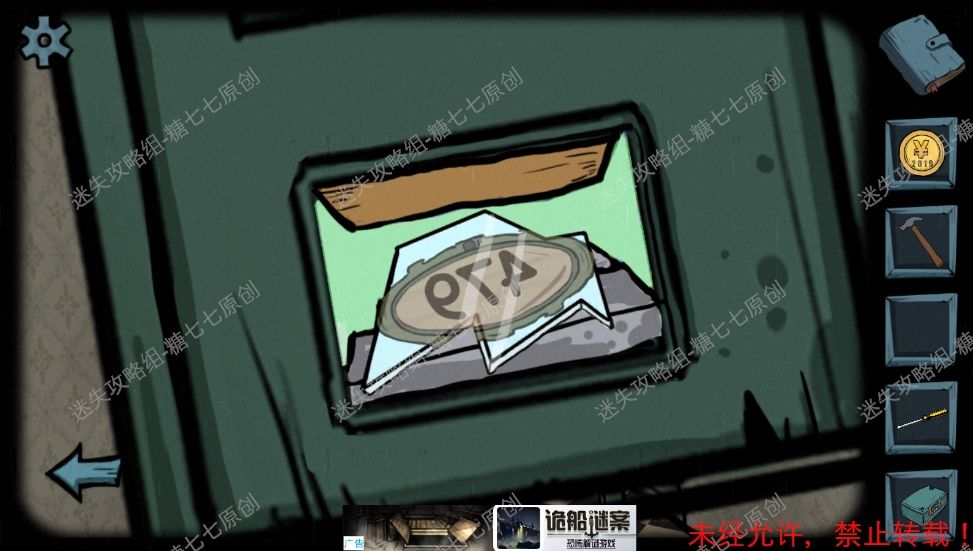 46、用武士刀砍掉电脑前多余的树枝。47、回到现在,发现桌子上的树枝已经不见了,可以看到电脑上的纸条写着TFIK。打卡桌子的抽屉,取出轮子。47