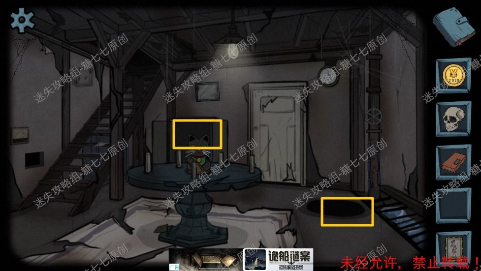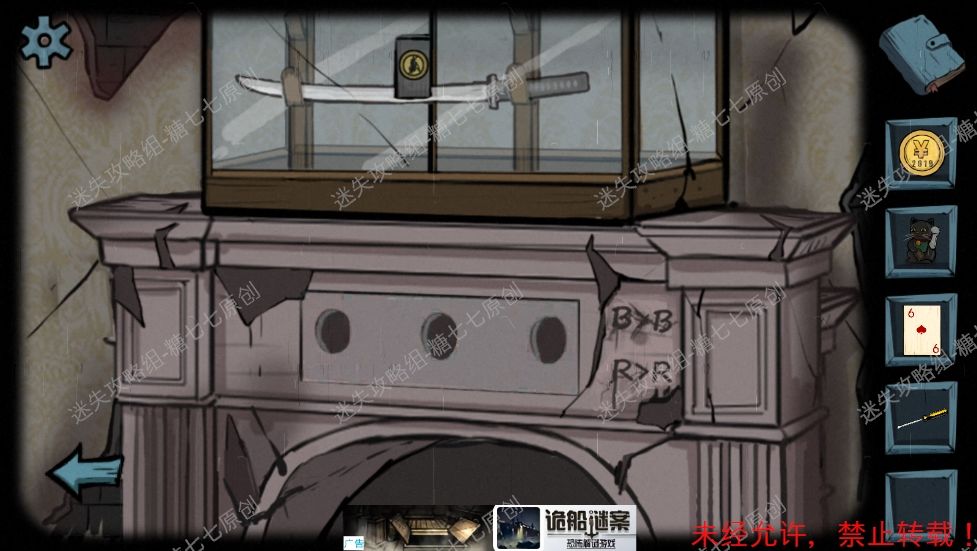 62、刚擦干净的血迹下面有一张密码纸,这个密码也就是刚找到的箱子的密码,上面写着blood,然后在每行把相对应的字母找到,b=3,l=2,0=4,0=1,y=5,然后按顺序点击盒子上的按钮。得到一个头颅,取出头颅里的黑色猫眼,把猫眼装到猫上。62/621