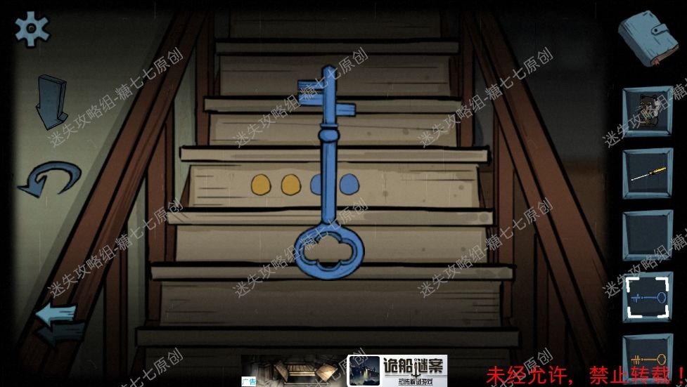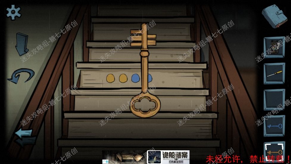 34、然后去楼梯,发现楼梯有四个圆,观察蓝黄两把钥匙,两边的锯齿各有不同,按照锯齿方向,黄色左二右三,蓝色左二右一依次点击按钮,发现缺少一颗宝石。34/341