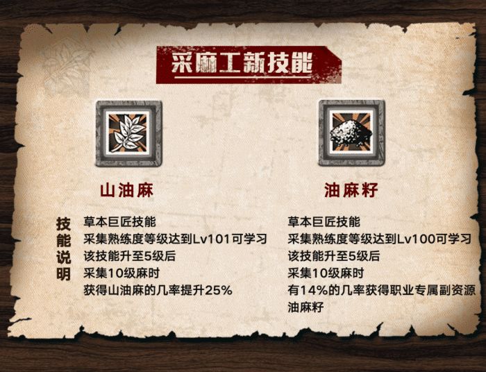采麻工----新天赋技能:山油麻技能可以大幅度地提升采集10级资源图时采麻获得的山油麻数量,而油麻籽技能将解锁10级专属副资源采集资格,可以在采麻时获得专属副资源油麻籽。