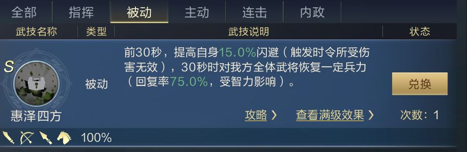 被动武技:分为两种,一种是直接触发,另一种是有前置条件,如释放主动技能后、受到连击后、兵力低于50%等等前置条件才能触发