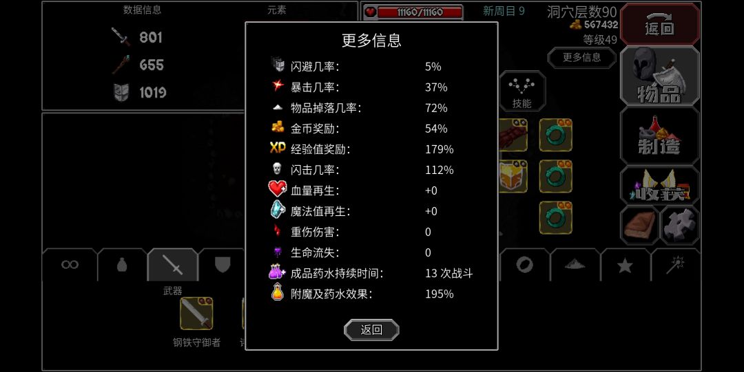 一两周目选手对这个其实没啥需求,看情况自己随便弄点就好了。还是说爬高,由于最后的两个大BOSS是没有元素攻击的,所以我们选择材料的时候就只留六种。经验(两个妖灵合一个40经验药水,刷90到99必磕,升级贼快),防御(其实这个可有可无,40点防只减40点伤害),魔力,闪避,流失和重伤。这些材料90到99都有产出,商店卖经验,重伤,闪避和魔力,防御和流失要翻箱子,基本上我都是在刷药水时候翻箱子,翻到两个就直接合成点金带身上,足够用。
