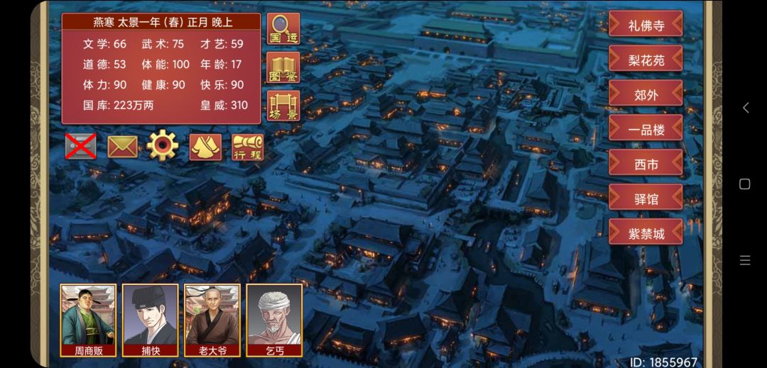 出发之前,我先换了身便服,毕竟是微服出巡,不能太过显眼。当我们来到咸阳的商业街时,天已经黑了。晚上的市集似乎更加热闹,各种各样的店铺灯火通明,街道上人来人往,吆喝声此起彼伏。路过街摊时,一位姓周的商贩带着商人似的标准笑容向我推荐他的商品,“王婆卖瓜”般的介绍实在是让我有点招架不住,最后我还是买下了他的商品。这是一件稀世珍宝,也不知道是不是真的稀世,不过到时候给妃子们装修宫殿的时候应该用得上。正要付钱时,我发现自己的钱袋没了,场面一时间非常尴尬。此刻人群中有位老大爷在大喊:“有飞贼啊,大家快帮忙抓飞贼”,不用多想,我的钱袋肯定也是被偷了,连忙招呼羊祜追赶飞贼。