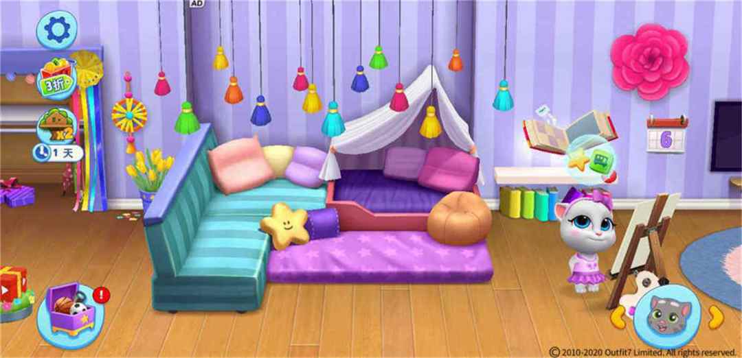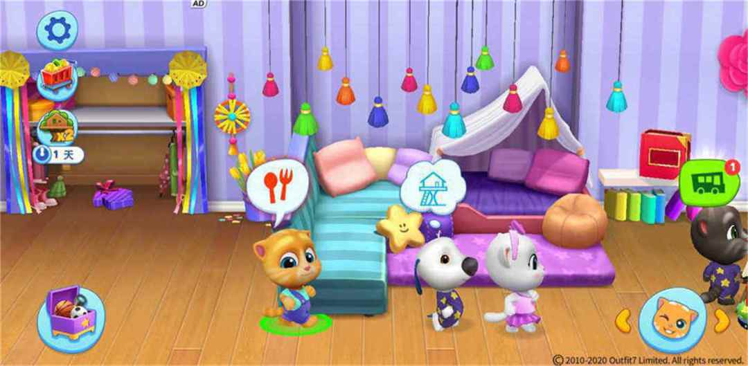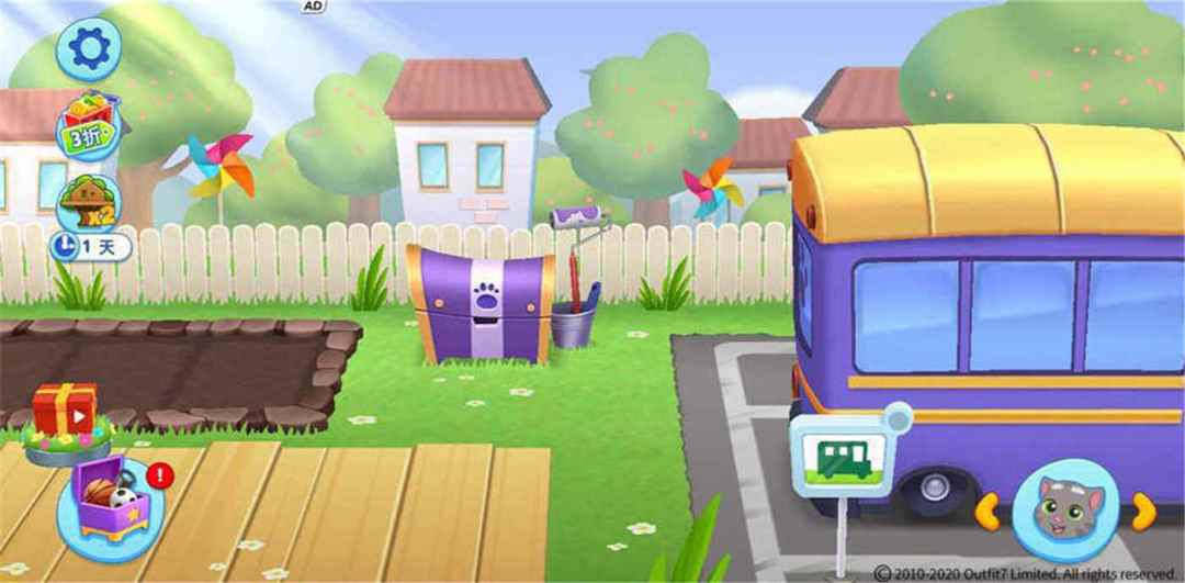 美轮美奂的场景也是养成系游戏的加分点之一,《汤姆猫总动员》一共分为了4个板块。拥有大泳池、木屋、沙坑的公园;拥有各种玩具、供它们休息的床、游戏机、餐桌等的大客厅;有它们生病时提供医疗帮助的医护室、解决洗澡问题的大浴缸的卫生间;还有可以种植的种植花园,在种植花园的旁边还有一辆巴士,巴士可以带它们前去商店采购物品!