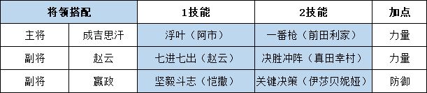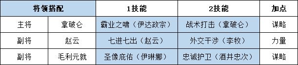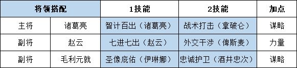 该阵容的核心输出是诸葛亮,所以诸葛亮在搭配技能的时候,全部为输出服务。赵云主要承担扛伤和恢复主将兵力的作用,所以扛伤技能必须有,另一个可选拥有物理输出的技能,触发单骑救主的附加效果。而毛利元就的作用就是辅助,保护赵云的同时提升主将输出能力。