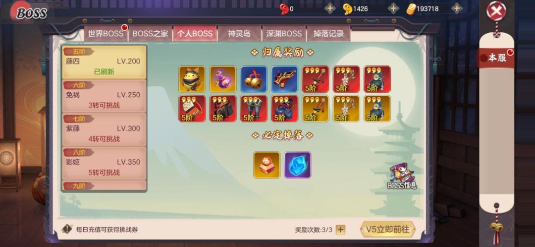 个人BOSS是玩家们获取装备最快最好的方式,也是小师妹比较推荐的装备获取方式。如果不想和大佬们争夺BOSS,又想获得最好的装备,个人BOSS是玩家们的不二选择。玩家可通过充值VIP前往挑战个人BOSS,通过每日充值也可获得挑战券。击杀个人BOSS掉落的装备为衣服、武器、鞋子、裤子、护腕、帽子。个人BOSS的每日奖励次数为3次,VIP等级提高可获得购买额外的奖励次数。