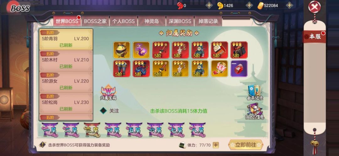 世界BOSS对所有玩家开放,击杀BOSS掉落的装备为衣服、武器、鞋子、裤子、护腕、帽子。只有一层世界BOSS只要参与击杀即可获得奖励,其他层均会根据伤害排名判定奖励的归属。击杀世界BOSS将会消耗体力,层数越高的BOSS消耗的体力越多。