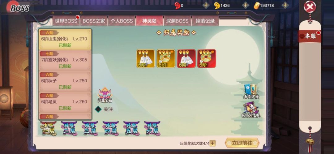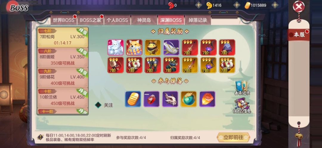 深渊BOSS每日11点、14点、18点、22点定时刷新,击败深渊BOSS可获得衣服、武器、鞋子、裤子、护腕、帽子这些极品装备,而且是双倍掉率。深渊BOSS每日的参与奖励次数为4次,归属奖励次数为4次。由于深渊BOSS是跨服活动,所以竞争比较激烈,但奖励十分丰厚,建议有实力的玩家前往挑战。