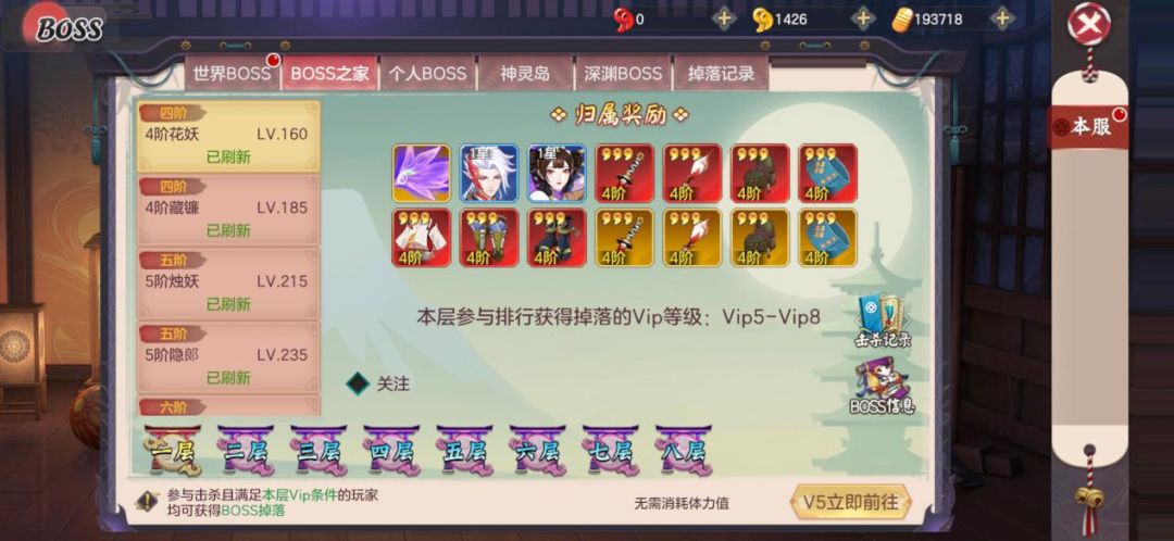 成为VIP5即可挑战BOSS之家一层,VIP等级越高可进入的层数越高。BOSS之家的BOSS掉落的装备为衣服、武器、鞋子、裤子、护腕、帽子、均高于4阶3星,击杀层数越高的BOSS奖励越丰厚。且在BOSS之家只要参与击杀且满足本层VIP条件的玩家均可获得BOSS掉落,也无需消耗体力值,这奖励简直太诱人了!