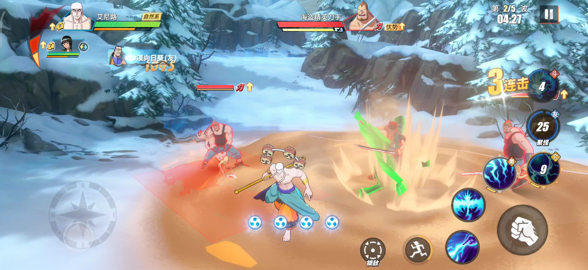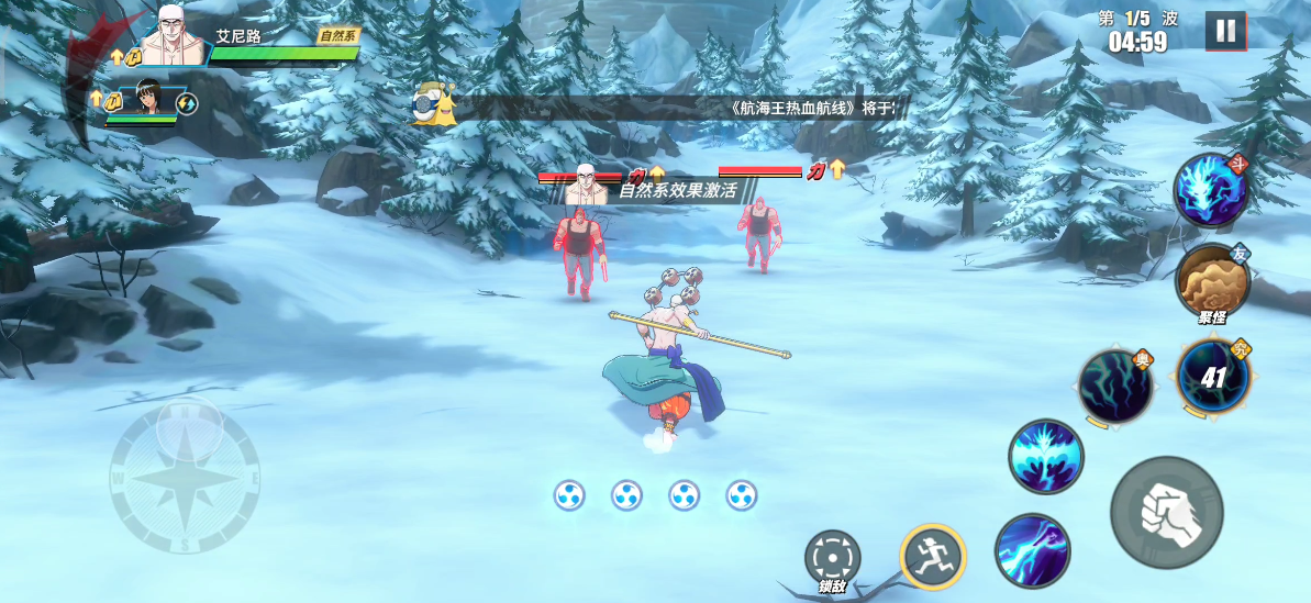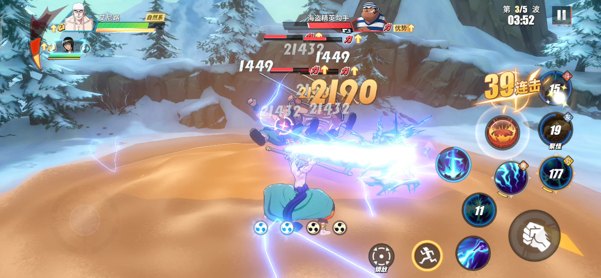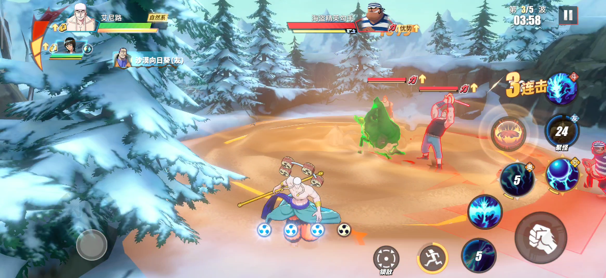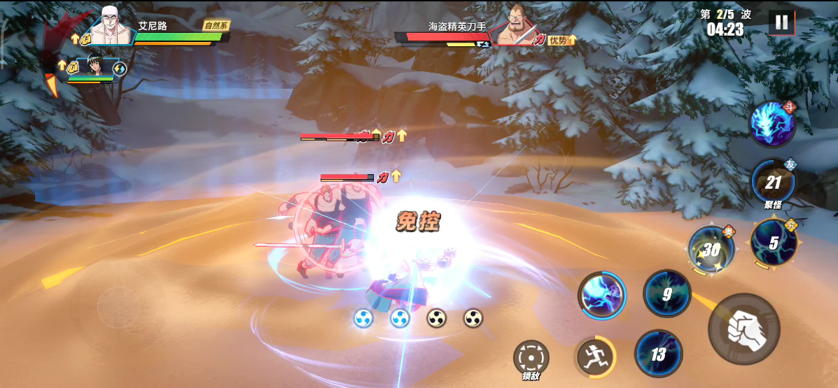 敌人登场后,我们直接使用鳄鱼助战聚怪,随后利用AOE技能输出。聚怪时需注意刀手的蓄力攻击,可闪避拉开后反身攻击。若无聚怪助战技能,那么我们可以先找到能够同时击中2个目标的位置,再进行攻击。