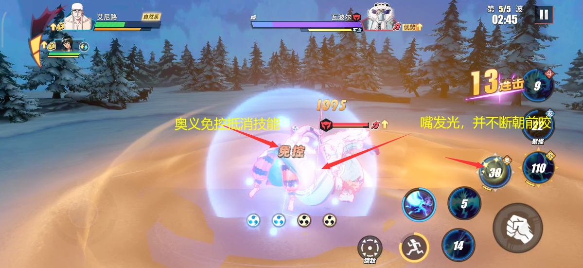 躲避技巧:瓦波尔的嘴会发光,而且只有在胖子瓦波尔形态下才会释放这一招,因此当胖子瓦波尔嘴发光时,我们就往后移动即可。如果没有时间躲避,那么我们也可以利用奥义技能的免控来抵消此次攻击。