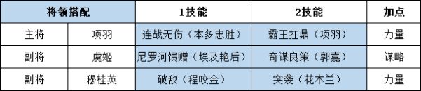 基于穆桂英和虞姬这两个易获得的将领搭配。因为虞姬自带技能的附加效果,选择项羽作为主将,满级之后恢复率高达160%,能大幅恢复项羽主将的兵力。