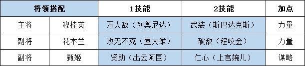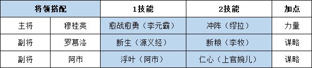 该阵容为前期开荒阵容,以穆桂英为主C、流血状态为核心进行搭配。考虑到开荒的效率问题,选择了两个输出一个辅助。两个输出满足开荒对输出的要求,一个辅助将领搭配恢复技能,减少了兵力上的损伤。最关键的是,这些英雄和技能获取难度不高,前期开荒效果还不错。